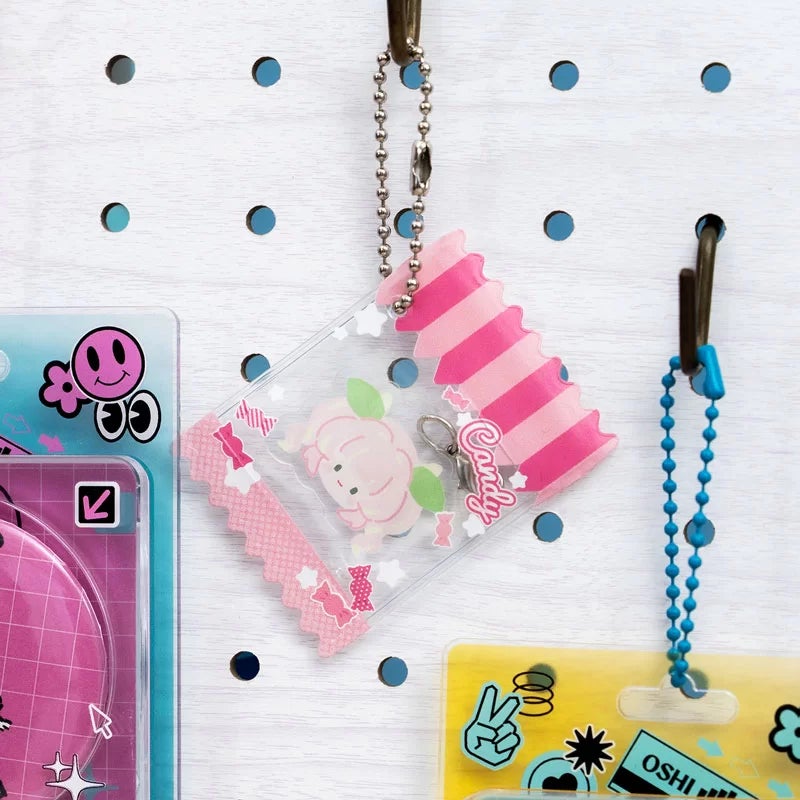本商品は、まるでお菓子のパッケージのような可愛いデザインが特徴のキーホルダー型ミニケース。片面クリア仕様で中身が見えるため、缶バッジ・小物・ミニフォトなどを入れて“見せる収納”を楽しめます。表面にはフルカラー印刷が可能で、写真やキャラクターデザイン、ロゴなどを高発色で再現。ファンクラブグッズ、イベント景品、ガチャ風グッズ、企業ノベルティまで幅広い用途におすすめです。