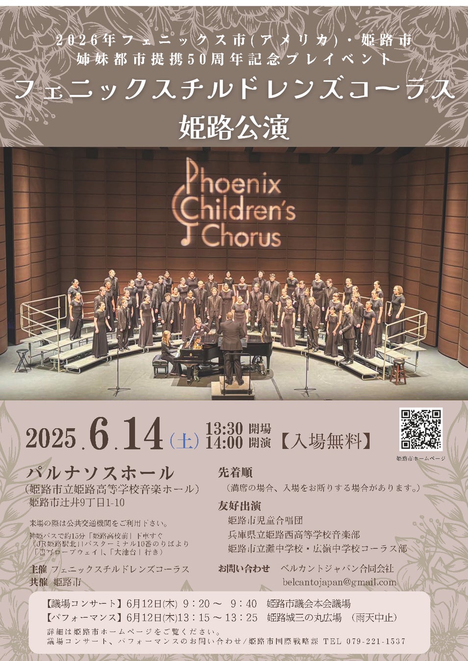 2026年に、姫路市は海外姉妹都市であるアメリカ・フェニックス市と姉妹都市提携50周年を迎えます。そのフェニックス市から、フェニックスチルドレンズコーラスが日本ツアーのために来日し、姉妹都市提携50周年のプレイベントとして、パルナソスホールでコンサートを行います。姫路市児童合唱団や市内の学校のコーラス部も参加します。