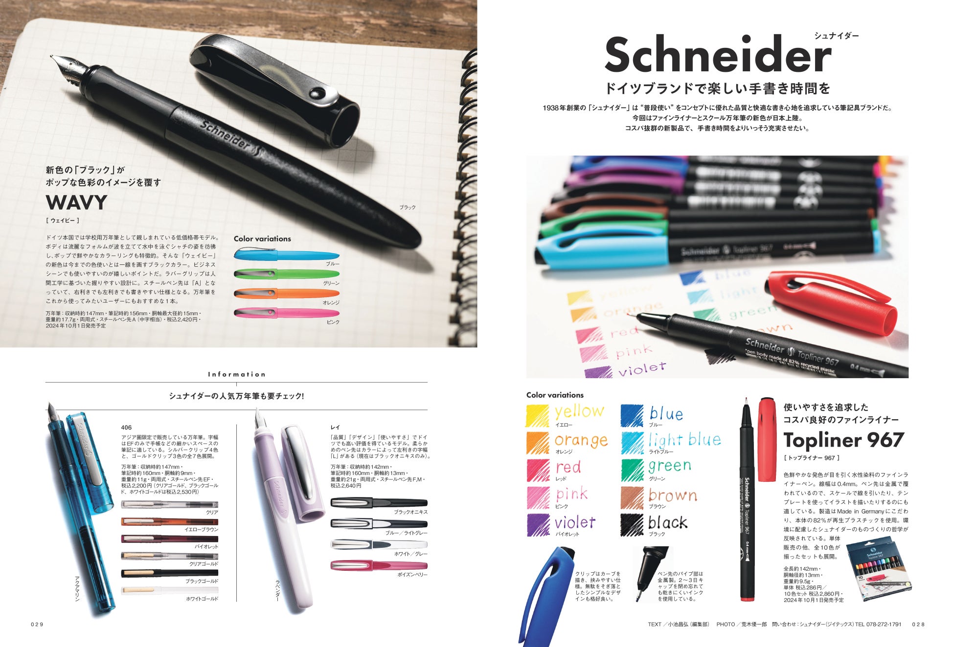 1938年創業の「シュナイダー」は“普段使い”をコンセプトに優れた品質と快適な書き心地を追求している筆記具ブランドです。今回はファインライナーとスクール万年筆の新色が日本上陸します。