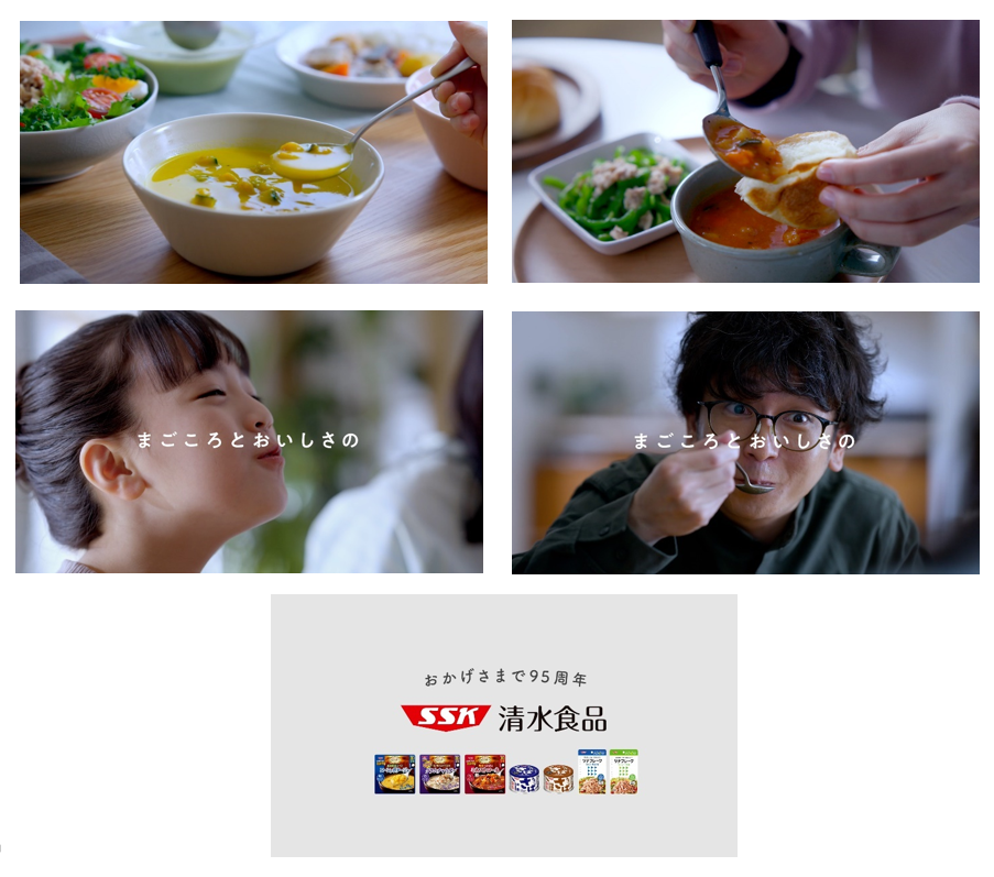 ついつい口ずさんでしまうリズミカルな音楽に「S・S・K」をのせて、お子様のいるご家族や夫婦、一人暮らし等様々なライフスタイルの食卓にSSKのスープやツナ商品が登場しています。SSK商品は常温での保存が可能なため「ご自宅にあるだけで、すぐに“おいしい“が食べられる!」をお伝えしたいと思い、本CMでは「スープを口に運ぶと思わず笑顔が溢れてしまうほど美味しい!」そんな姿を描いています。