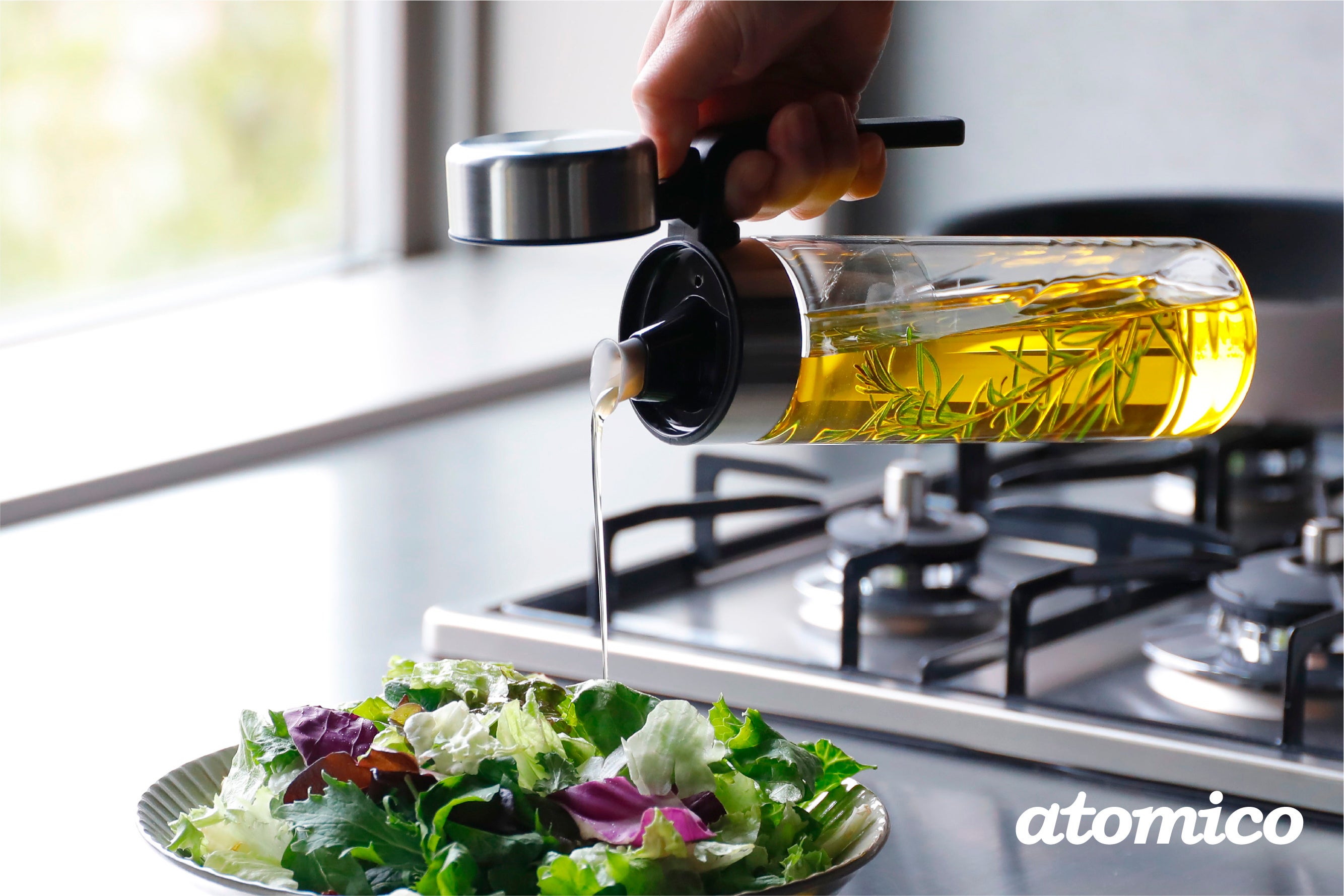 『atomico 耐熱ガラス密閉オイルボトル』は、毎日の“当たり前”を、ちょっと心地よくしてくれるキッチンの新定番です。