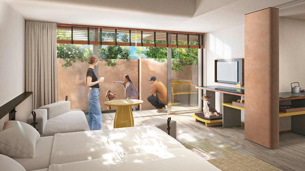 ホテルは幅広いお客様に快適に泊まっていただけるよう、多様な客室を備える計画で、一部の客室には愛犬と一緒に泊っていただける部屋を設ける予定です。さらに施設内には、愛犬と一緒に食事ができるテラスやドッグ関連の店舗を整備するなど、エリア全体でドッグフレンドリーな環境を目指してまいります。