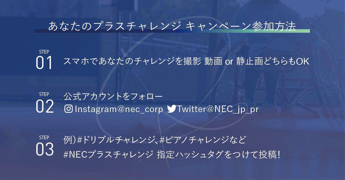 NEC公式Twitterアカウント「@NEC_jp_pr」かNEC公式Instagramアカウント「@nec_corp」をフォローし、指定ハッシュタグ「#NECプラスチャレンジ」で静止画か動画を投稿。Twitter か Instagramのダイレクトメッセージで当選連絡。後日郵送にて賞品送付。