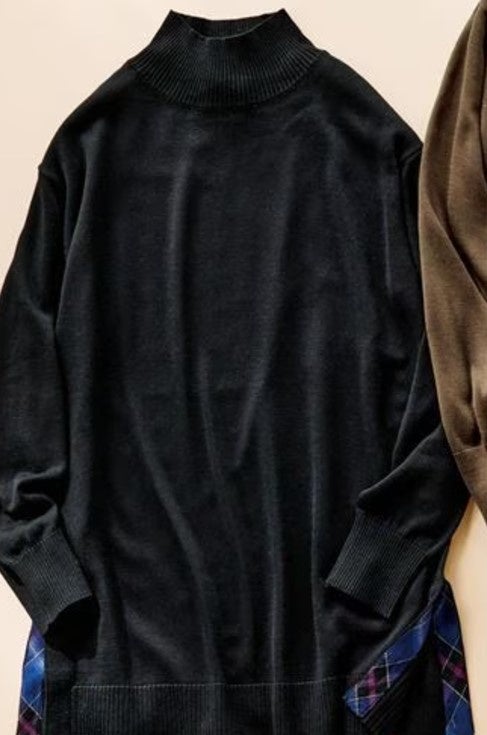 ハイネックで気になる首まわりもカバーしてくれるチュニックニット。ヒップが隠れる長め丈であたたかく、歩くたびにチラ見えする両サイドスリット裏のチェック柄がポイントです。