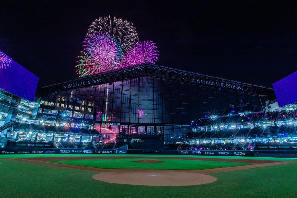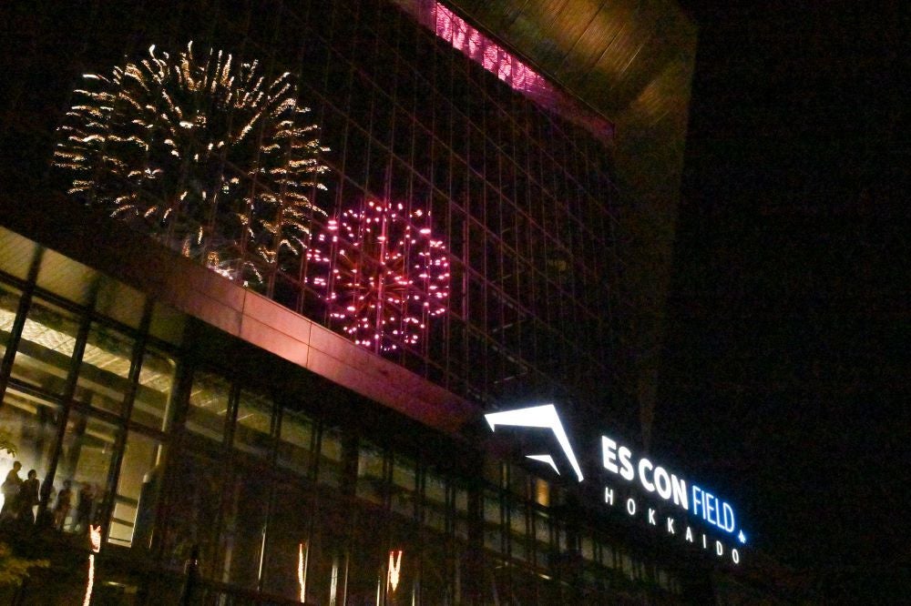 この日はエスコンフィールド最多動員の35,569人を記録。綺麗な祝い花が上空を彩りました。