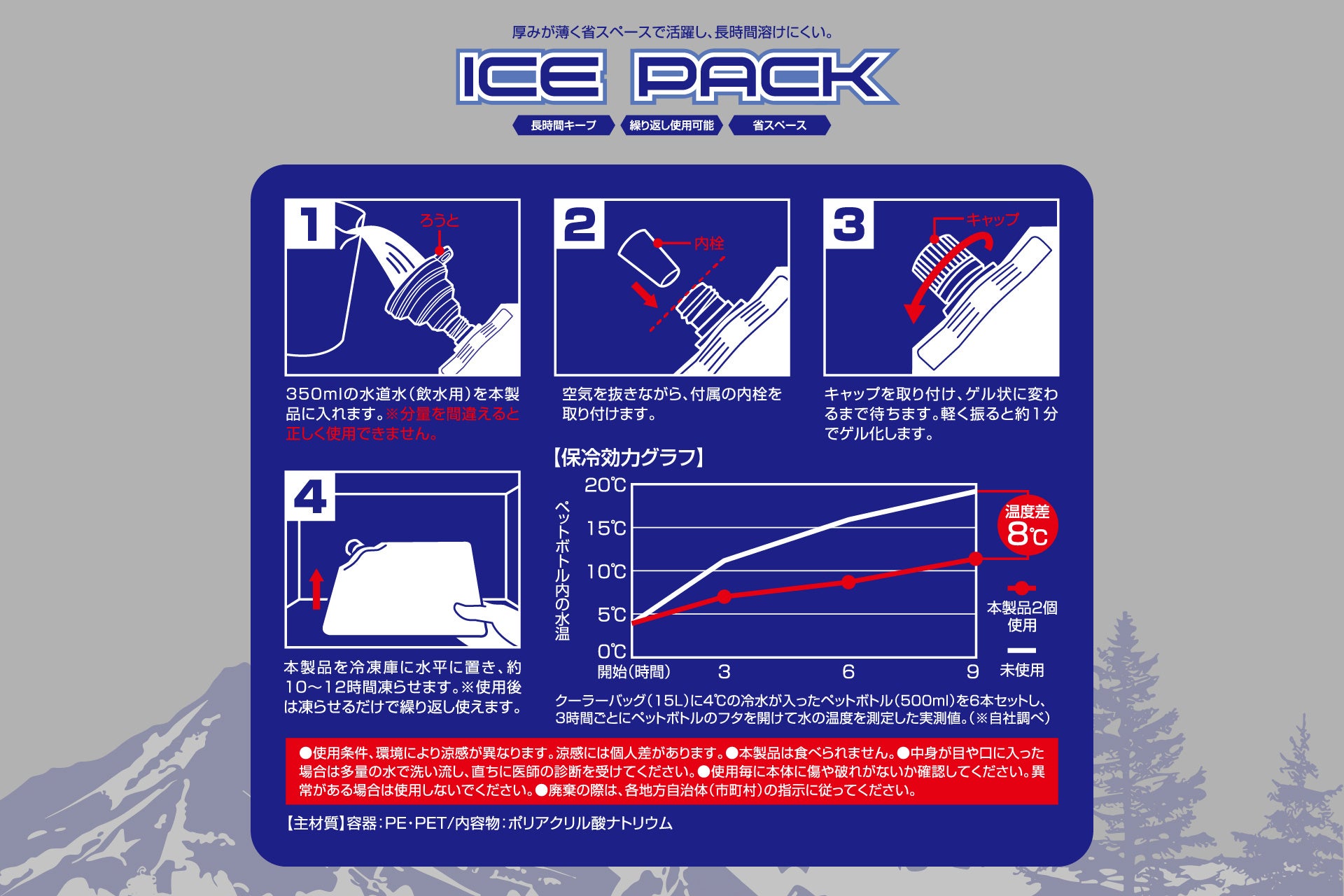 特徴:水を入れて凍らせるだけ!「再利用できるソフトタイプの保冷剤」ソフトタイプなので冷凍庫に収まりやすく、クーラ—バック内のすき間に入れ込みやすいのが嬉しいポイント。使用時の厚みは約2cmで省スペースに収まり、クーラ—バック内のすき間に入れ込みやすい!運動会やキャンプ、釣りなどのアウトドア時に大活躍すること間違いなし。