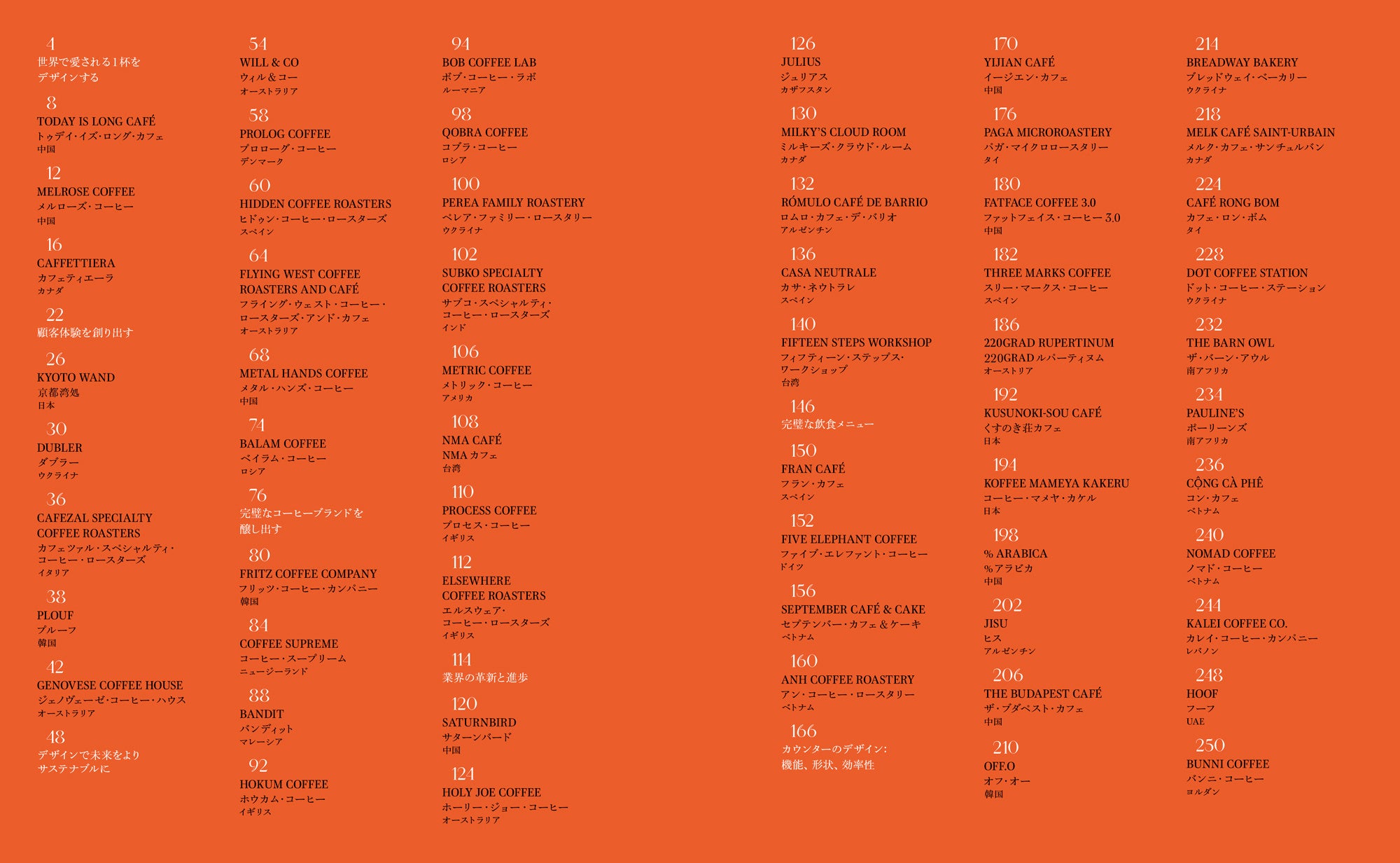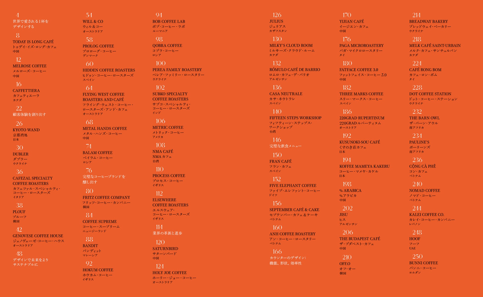 世界で愛される1杯をデザインする/顧客体験を創り出す/デザインで未来をよりサステナブルに/完璧なコーヒーブランドを醸し出す/業界の革新と進歩/カウンターのデザイン:機能、形状、効率性