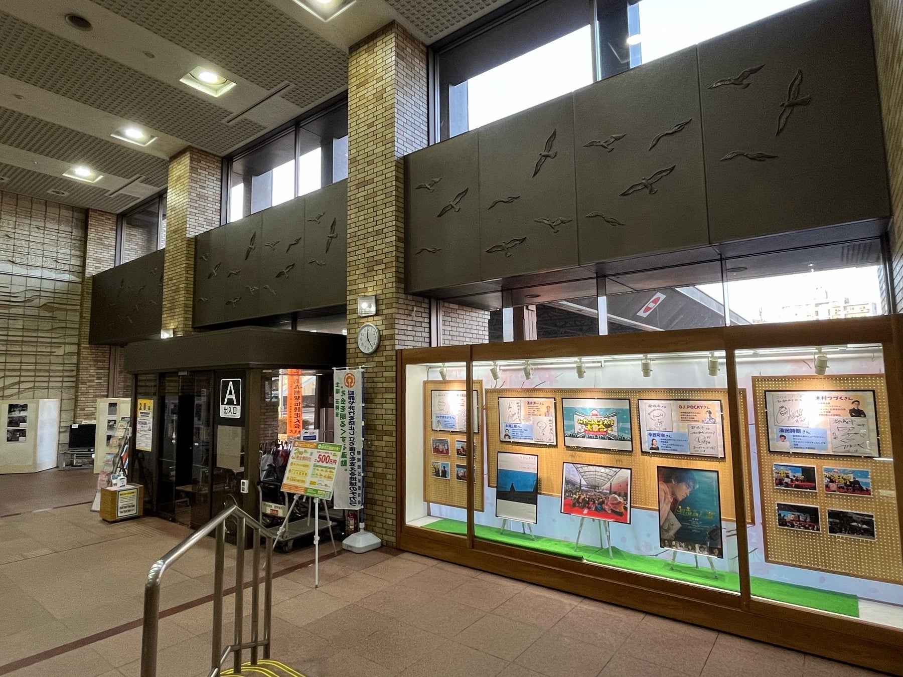 1月18日(日)に、まちなか広場で行われた新市誕生20周年記念事業「みやこんじょ大使大集合」の写真と、イベントに出演したみやこんじょ大使8人のサインを、市役所本館1階PRブースに展示しています。