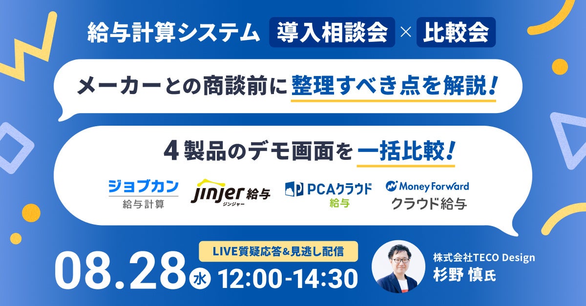前半部の『給与計算システム相談会』では、IT×人事労務のプロである株式会社TECO Design 杉野氏が登壇し、メーカーとの商談前に整理すべき点についての解説と質疑応答を実施します。