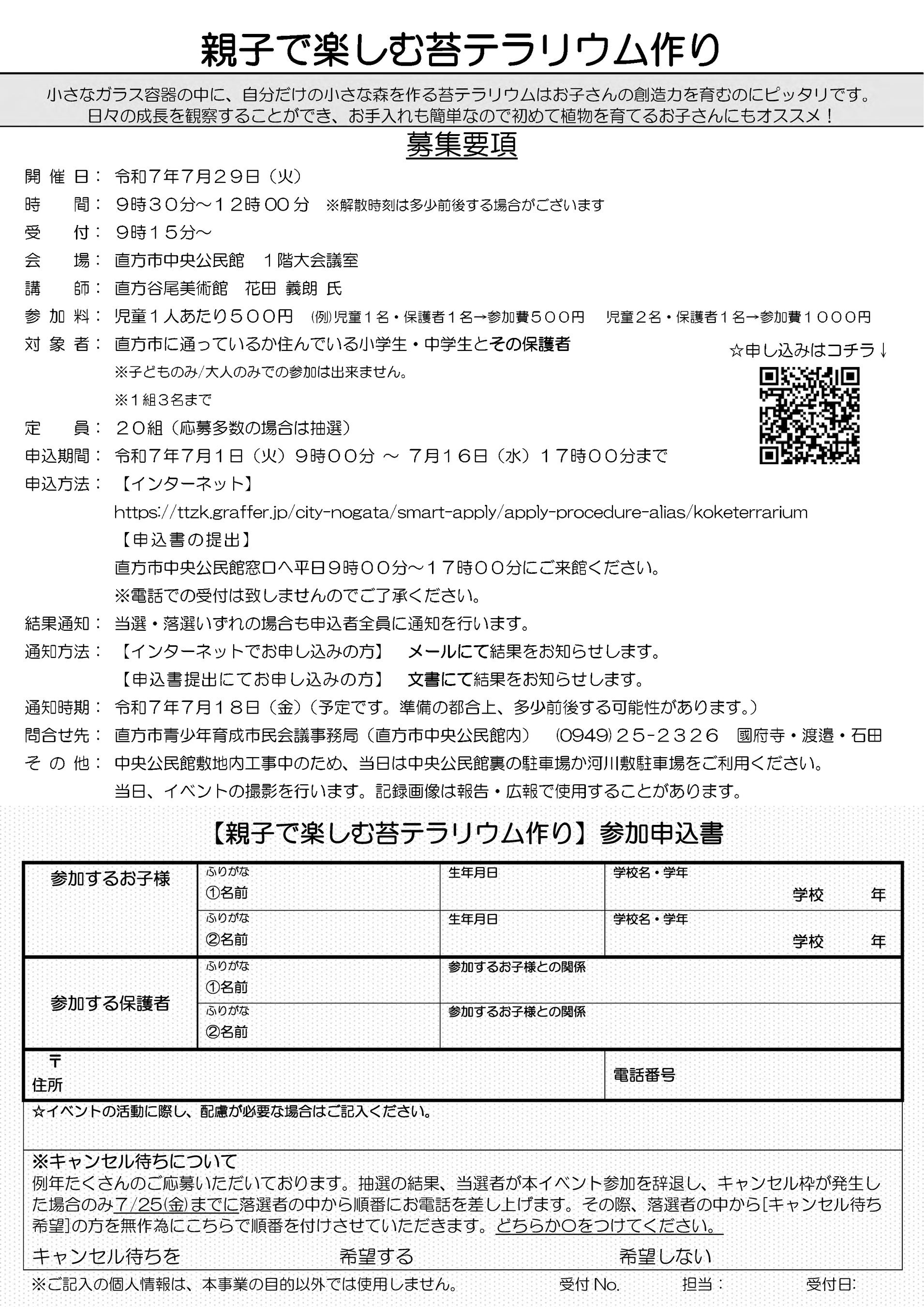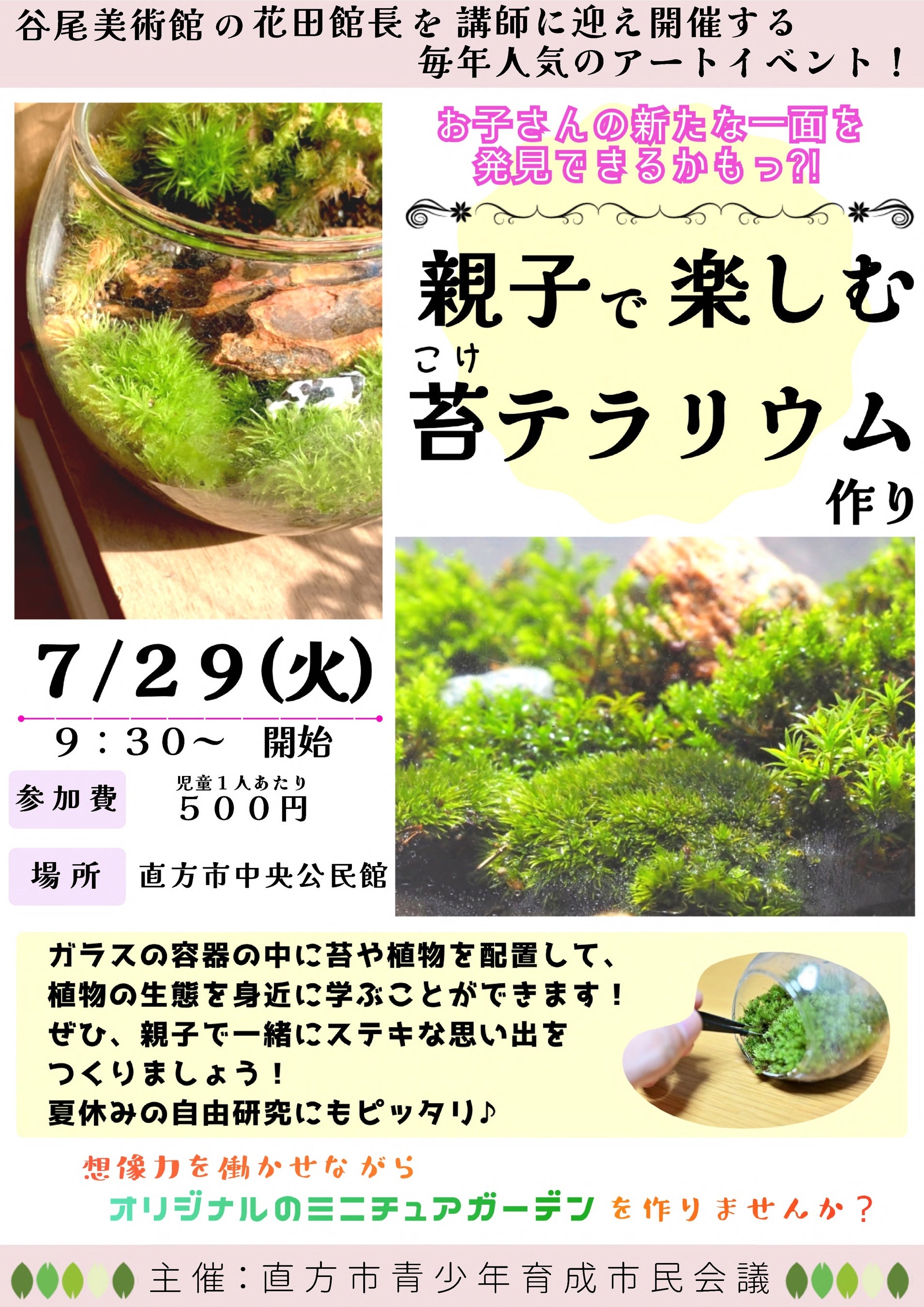 親子で協力しながら小さな自然を創り出す「親子で楽しむ苔テラリウム作り」を開催いたします。講師には、地域文化の担い手として活躍されている直方谷尾美術館 館長・花田義朗氏をお迎えし、自然美と創造力を融合させた体験イベントとなっています。