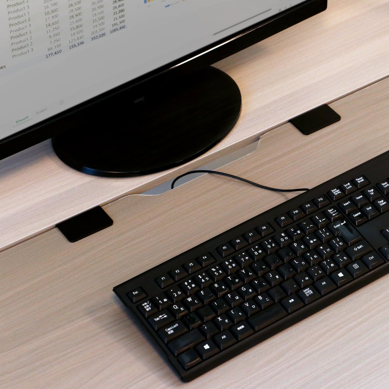 <隠れ猫スペース>の幕板(背板)をあえて手前側にずらすことで、市販のデスクアクセサリ用品のクランプが取り付けられる余裕を確保。