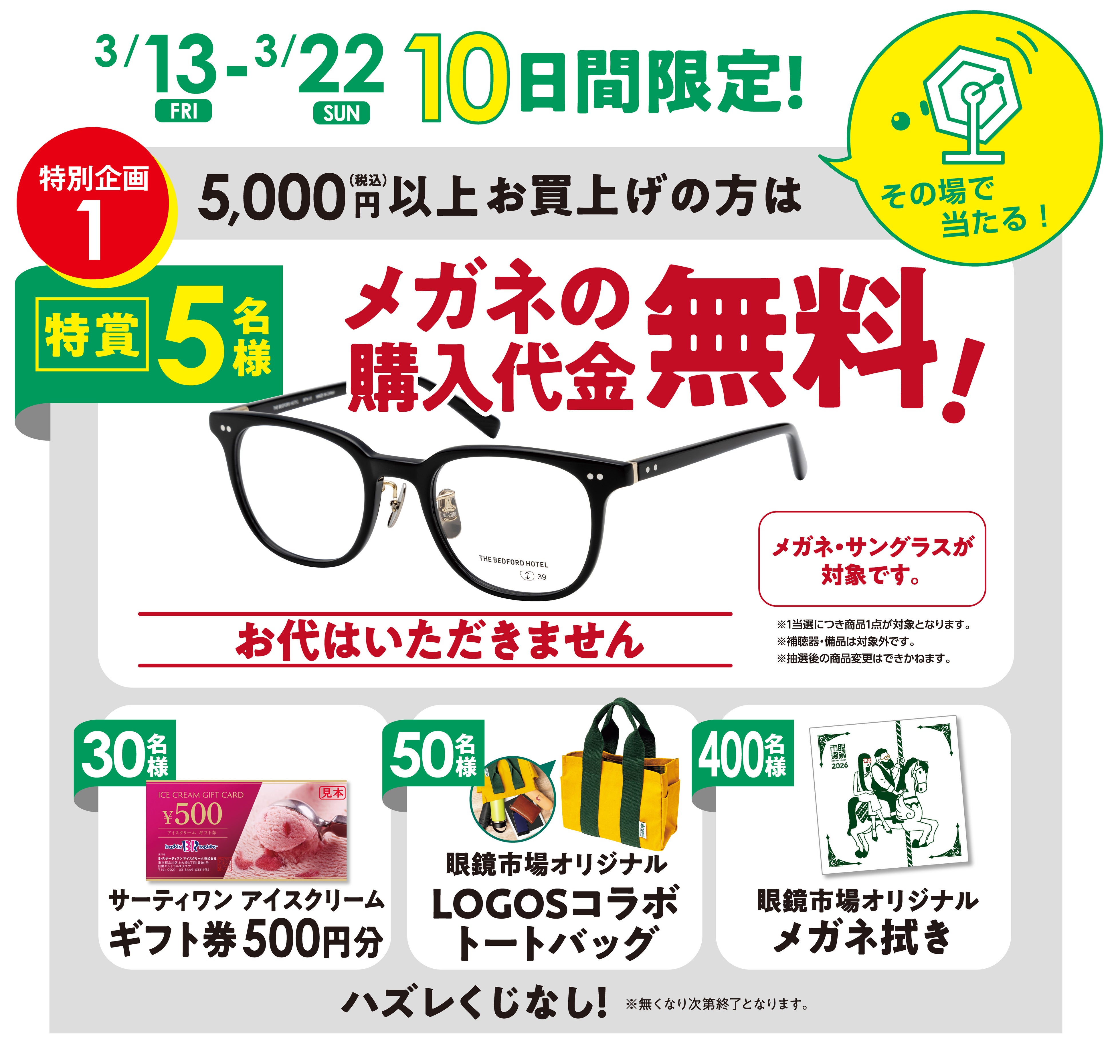 景品:メガネの購入代金無料(5名様)