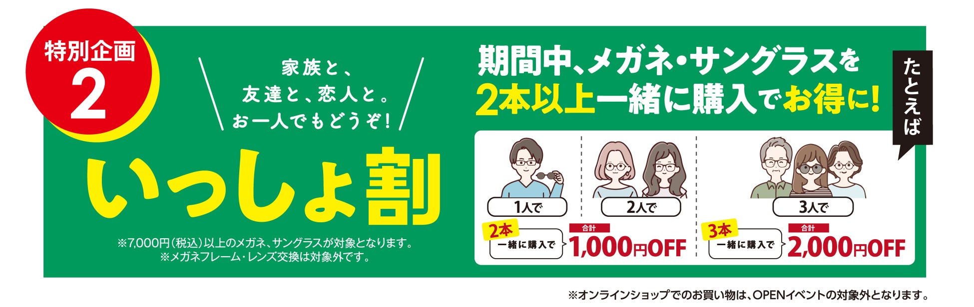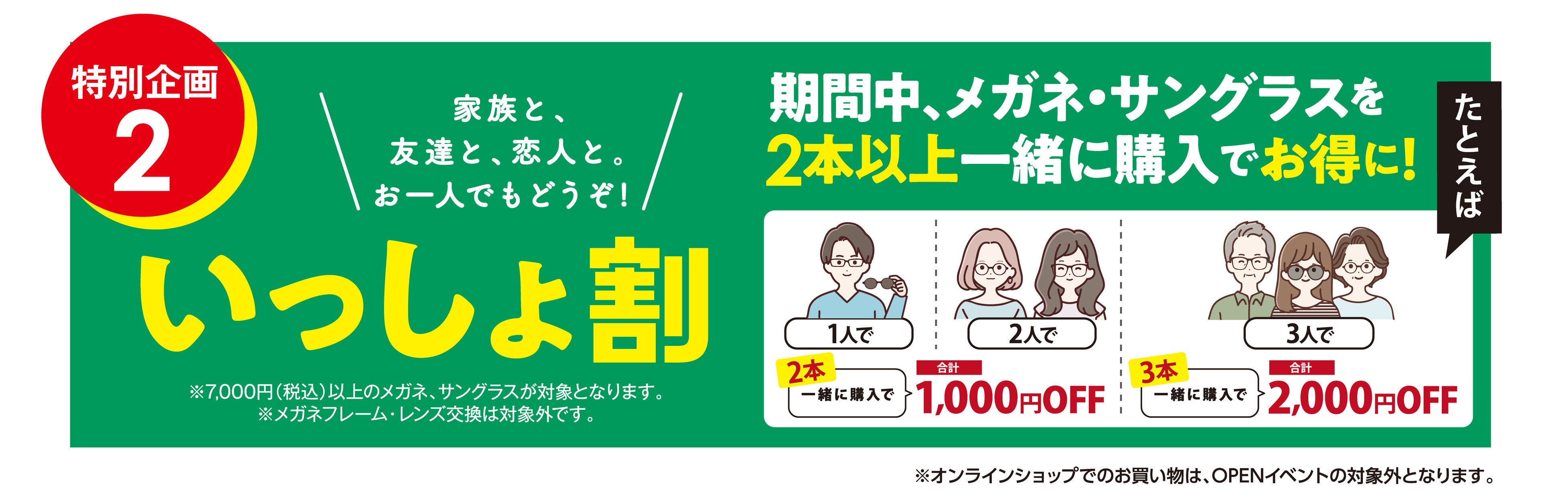 期間中、メガネ・サングラスを2本以上一緒にご購入いただくと、購入本数に応じた特典が受けられます。
