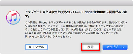 Step3:iTunesにメッセージが表示されますので「復元」を選択します。