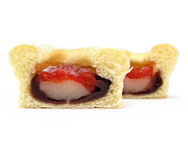 なめらかで上品な甘さのこしあんに、粒ぎゅうひと苺ジャムをのせて焼き上げました。