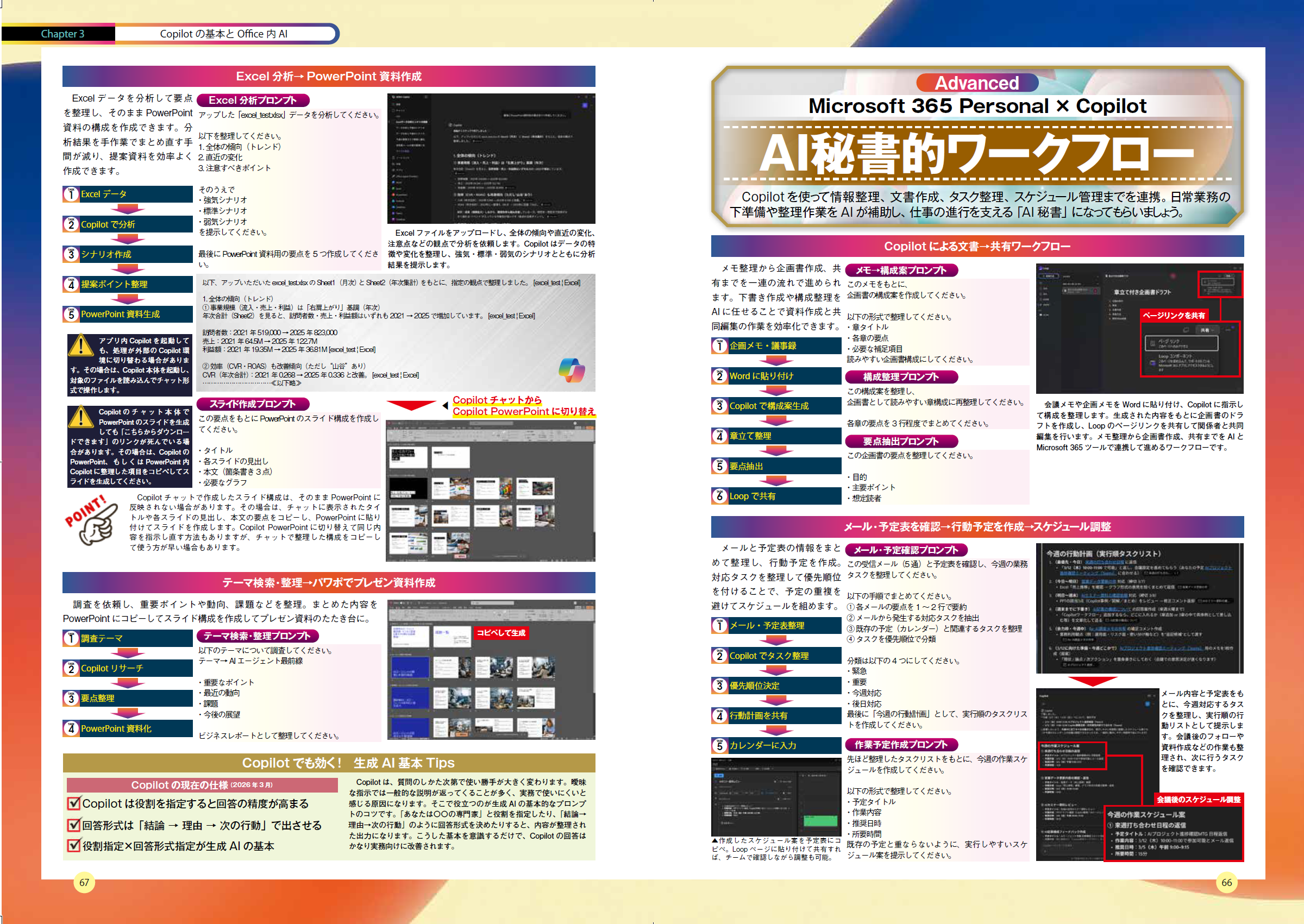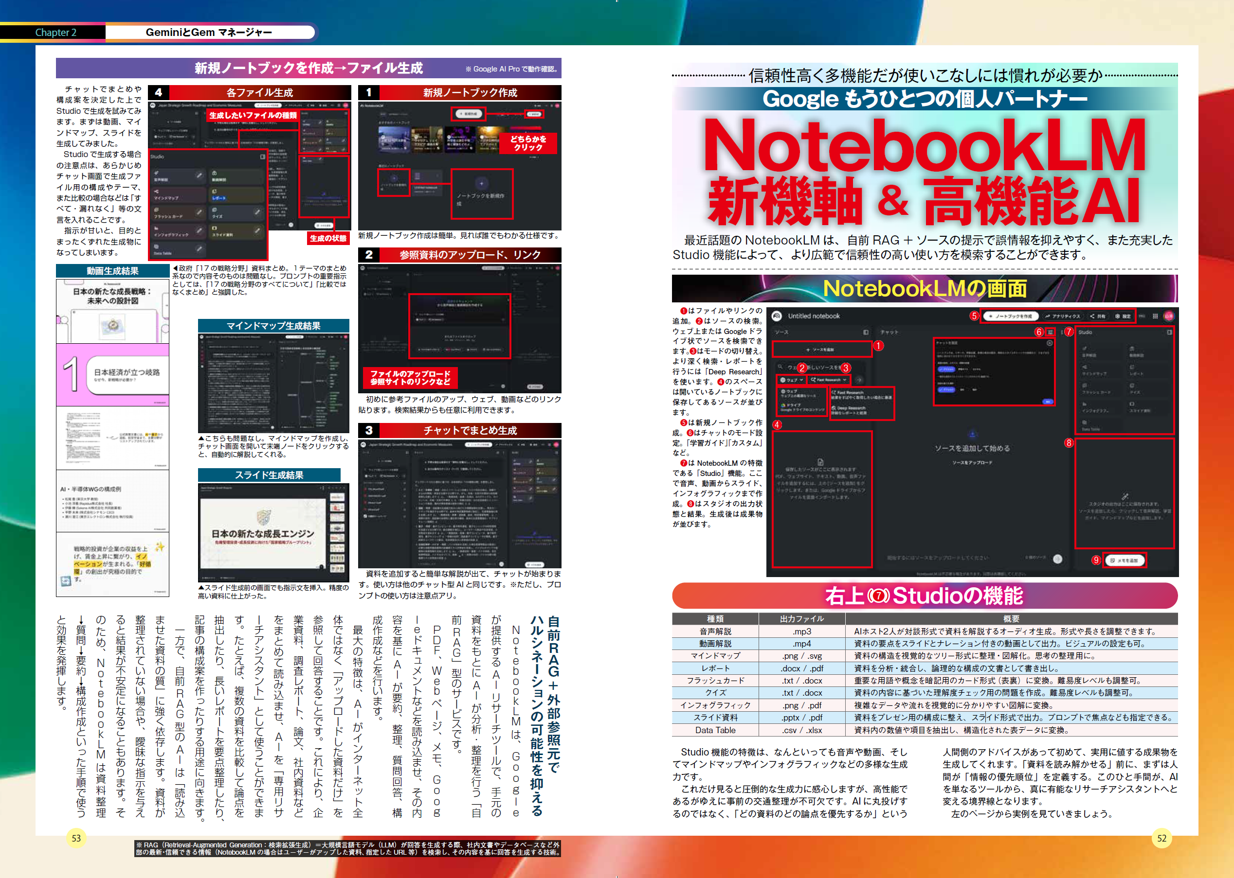 メール、マップ、スケジュール管理などGoogleアプリ、Microsoft 365 アプリとの連携、スマートフォン活用やライブでAIと会話して情報取得する方法など、マルチモーダルな使い方も掲載しています。また、話題のNotebookLMも丁寧に解説してあります。