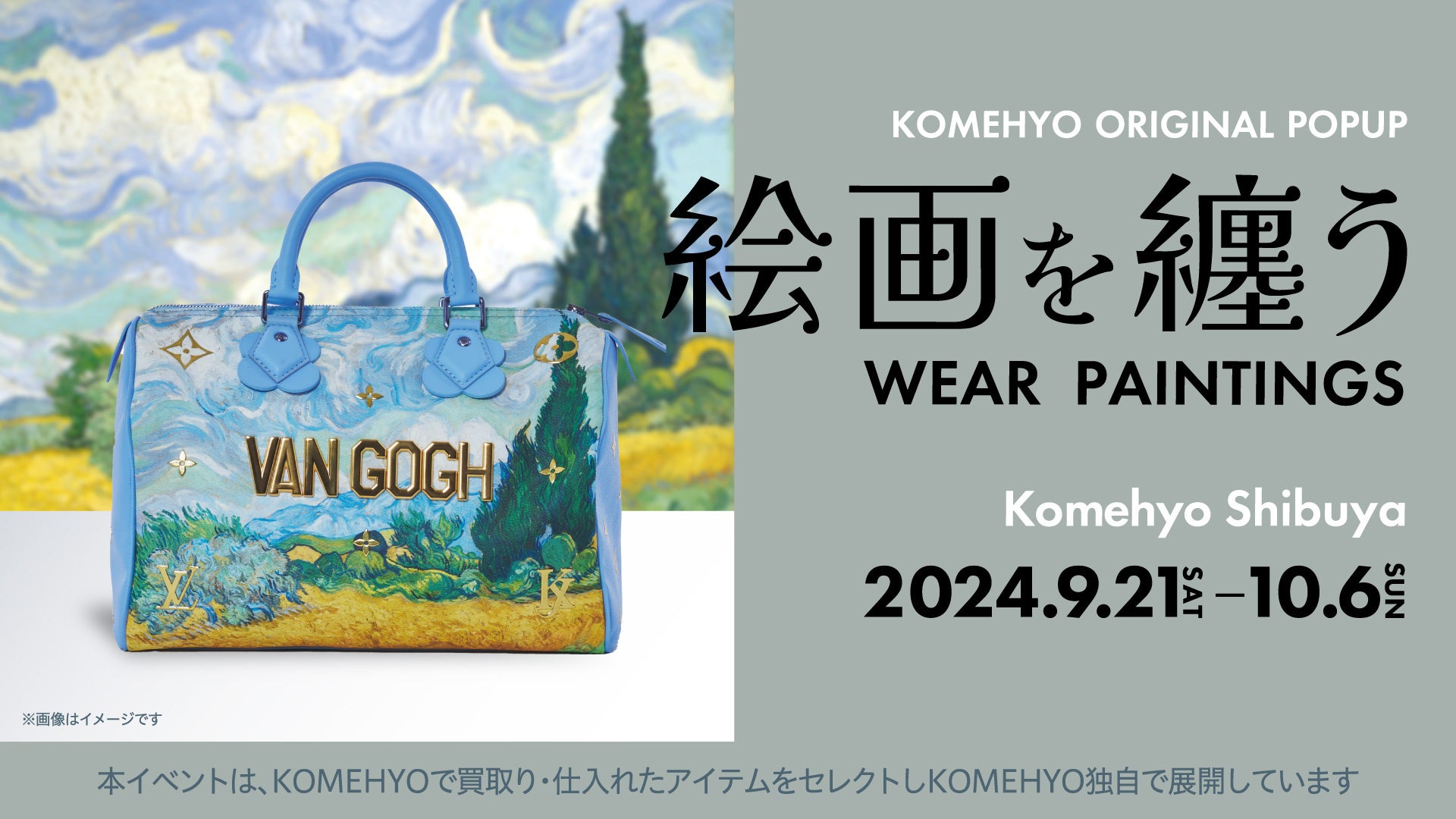 グローバルX・Y世代をはじめとする、若年層をターゲットとして昨年11月にオープンしたKOMEHYO SHIBUYA(運営:株式会社コメ兵、代表取締役 石原卓児)では、9/21(土)-10/6(日)までの16日間、『絵画を纏う』と題したPOPUP企画を実施、『アートピースを身に纏う』体験を提案いたします。