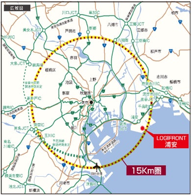 本施設は、東京都心部から15km圏内、首都高速道路湾岸線「舞浜」ICから約2.4kmに位置しており、幹線道路(首都高速湾岸線・国道357号線)による首都圏全域へのアクセスが良好なエリアとして利便性が高く、広域集配送の拠点として期待されている立地環境にあります。