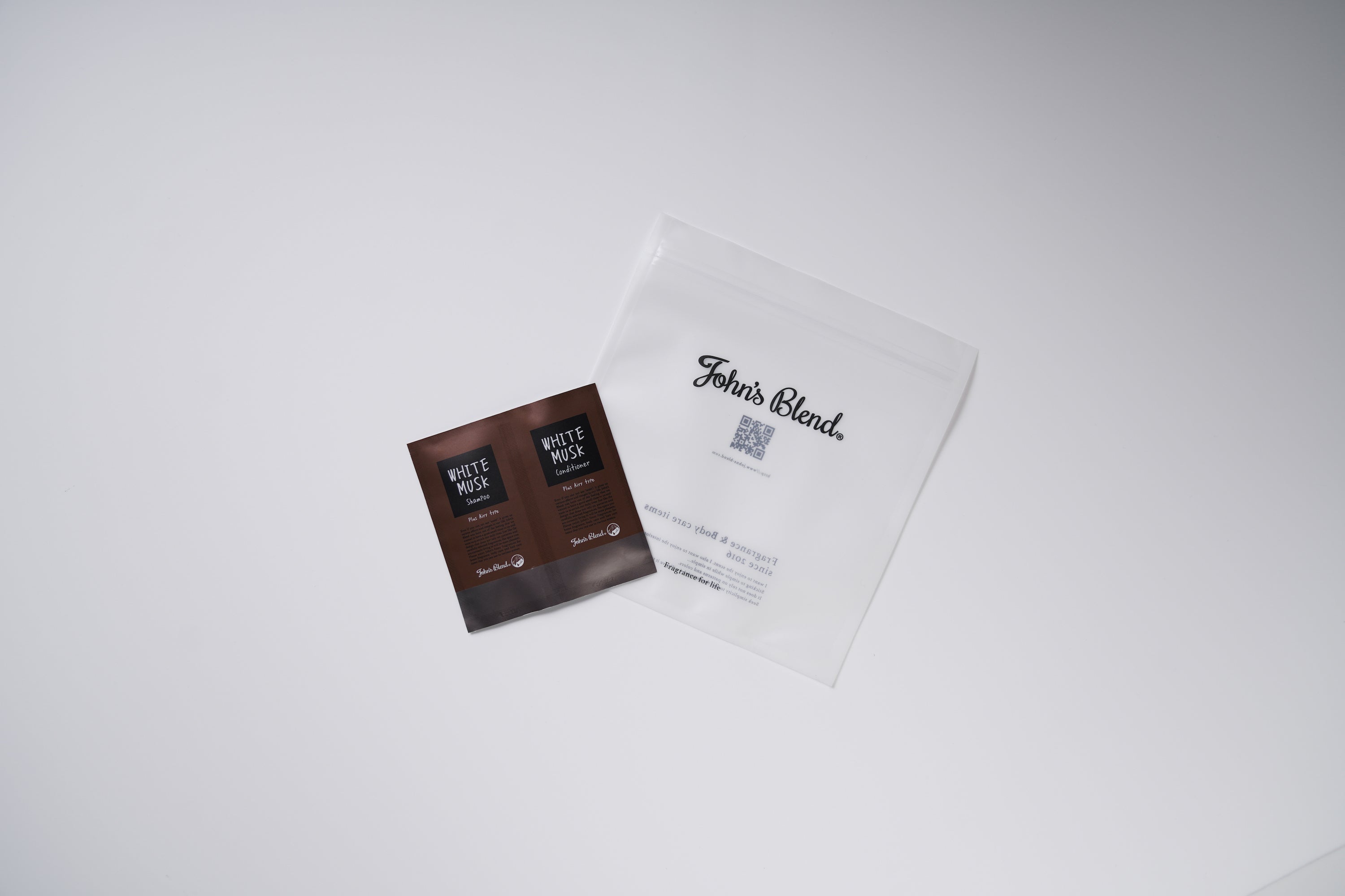 詰め替えタイプ・1回分お試しパウチは、John's Blendのキーカラーとなるブラウンに高級感漂うマットゴールドのツートーンで、落ち着きを感じるデザインです。