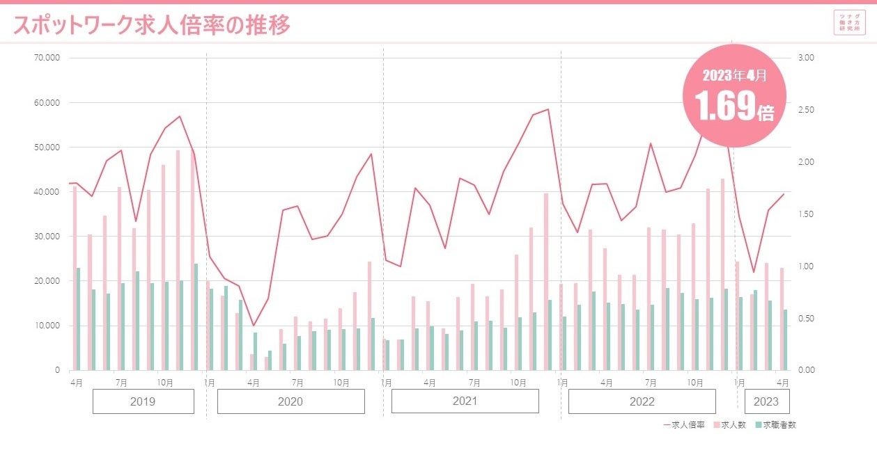 2023年4月度のスポットワーク求人倍率は1.69倍。前月比+0.15ポイントで、季節のトレンド通り前月より微増という結果となりましたが、前年比では-0.10ポイント低下しています。