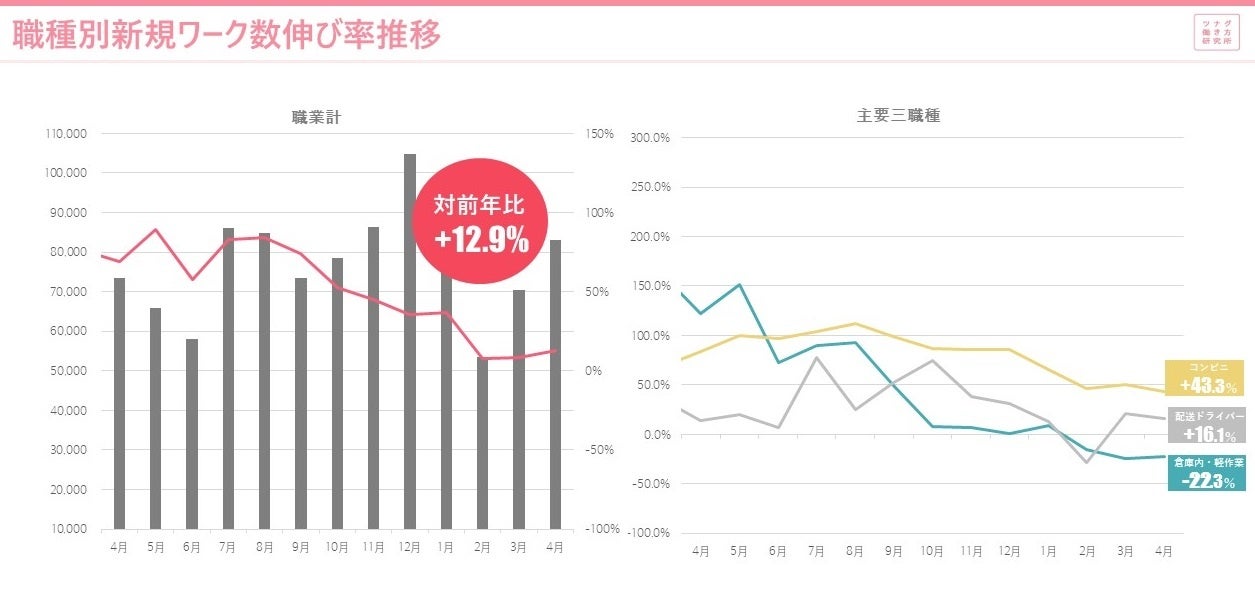 2.新規ワーク数は、対前年比で+12.9%。主要職種ではコンビニスタッフが+43.3%と伸長