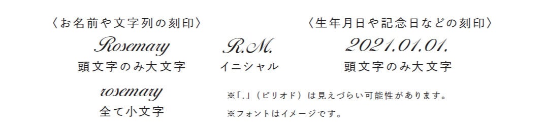 | -ご注意- ※刻印はイベント当日に刻印対象アイテムのご購入が必要となります。 ※お手持ちの商品へは刻印できません。 ※お渡しまで2 0 分程度お時間頂戴致します。 ※ 刻印後の返品・交換・修正は出来ません。 ※ 文字数や文字の幅によって若干のずれがある可能性があります。 ※アルファベット以外の文字・記号・特殊文字の刻印は出来ません。 |