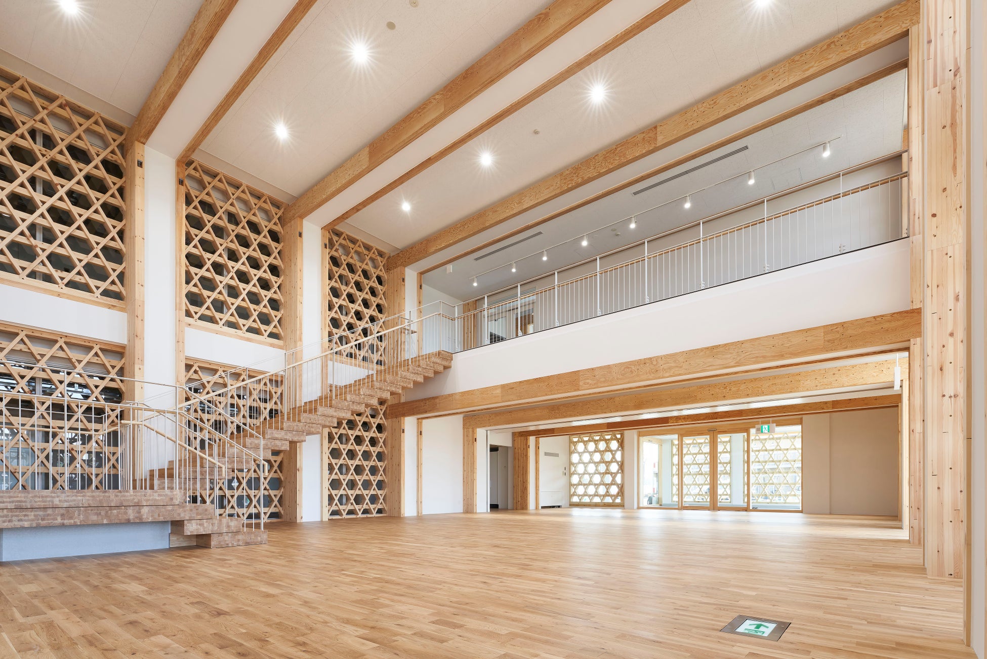 1) 免震装置に頼らない耐震構造による構造体の木を現しとした木造8階建て