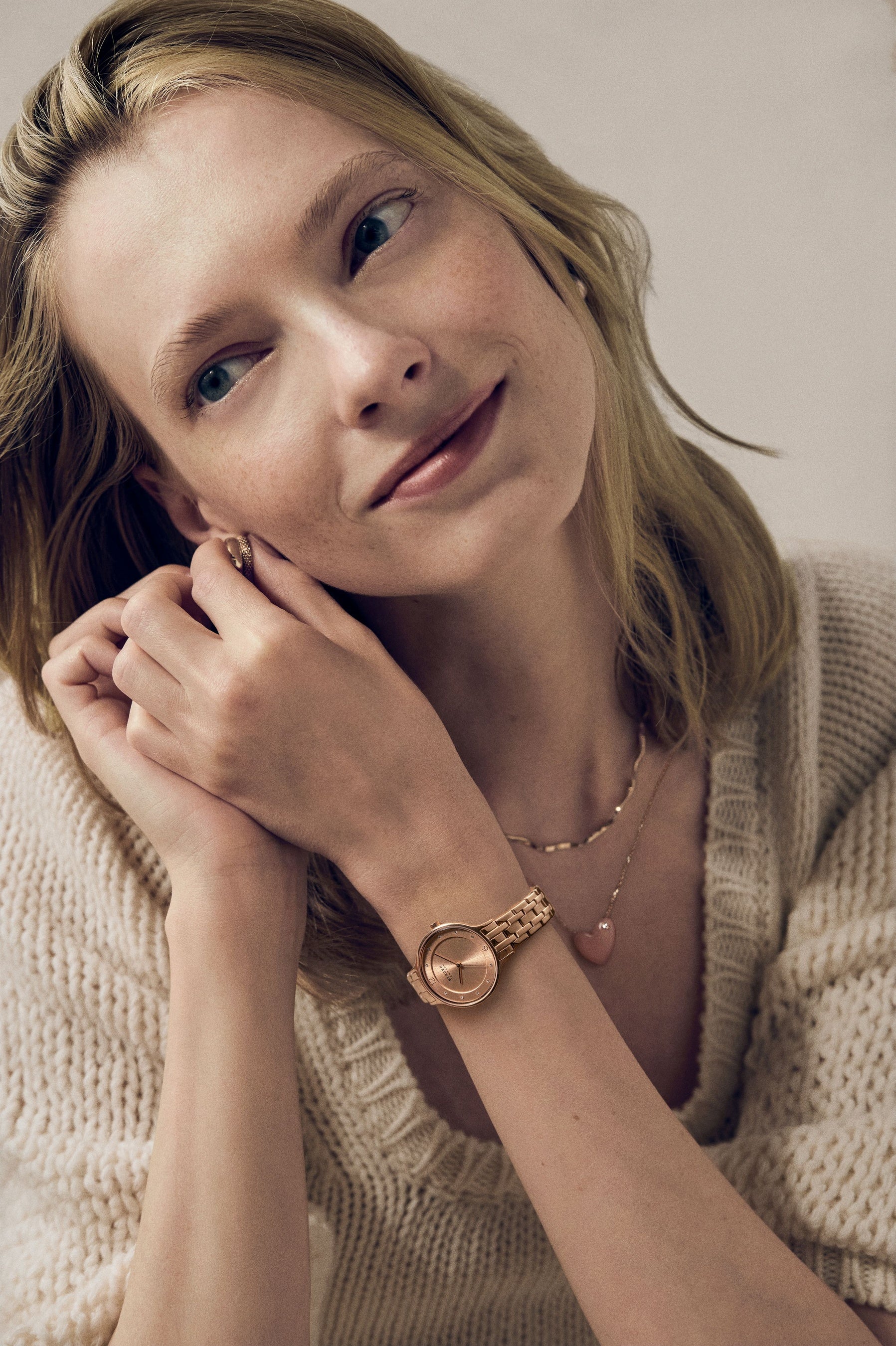 デンマーク語で"優美さ"を意味する「ANITA」は、シンプルなデザインでありながらも、アラビア数字とドットのインデックスが目を惹きます。さりげない輝きを放つサンレイダイアルと細身のブレスレットが春のコーディネートに華やかさを添えてくれます。
