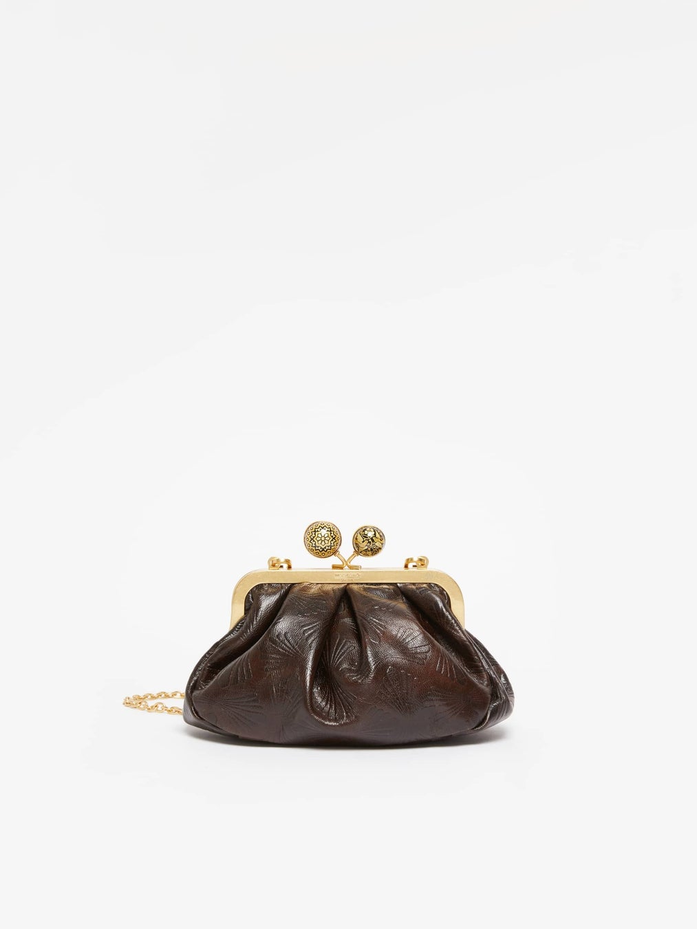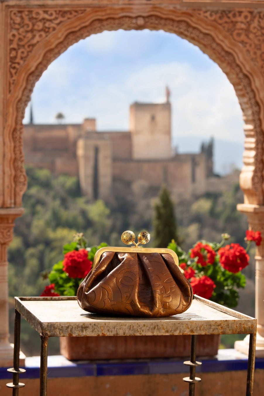 “パスティチーノ バッグ”のアイコンであるスフィア型のクラスプは、スペインの伝統技法、ダマスキナード(象嵌細工)によって、デコラティブに再解釈されています。彫刻された鉄にゴールドとシルバーが繊細に埋め込まれ、ブラックとのコントラストがその輝きを一層引き立たせます。またダマスキナードの後に二段階にわたって施されるゴールド装飾により、複数のゴールドの色調が生まれ、奥行きのある美しさが表現されています。更に、スフィアの輝きを長く保つため、最後に保護用ラッカーでコーティングが施されています。