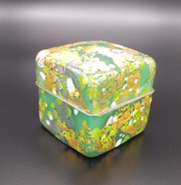 この緑の飾り筥は10cm角ほどの小品ではあるが、手に取ると見た目では感じられないくらいずっしりと重く、ガラスの透明性や箔が織りなすその凝縮された美しさが伝わってくる逸品である。
