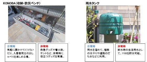 公園には、植栽の剪定グッズや防災グッズを収納したベンチ「KONOBA」やシェアサイクルなどを設置することによって、モノをシェアしながら交流を育み、豊かなコミュニティを醸成します。