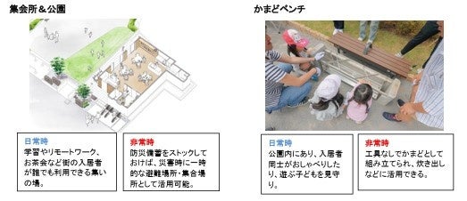 日常時はもちろん非常時にも役に立つようにデザインする考え方である「フェーズフリー」の思想を取り入れ、緊急時にかまどとして使用できるベンチ(かまどベンチ)や雨水タンクなどを、各住戸や街区内公園、集会所に設置しました。集会所や公園は非常時の拠点としても活用ができ、安心安全のために様々な工夫を街づくりに取り入れました。