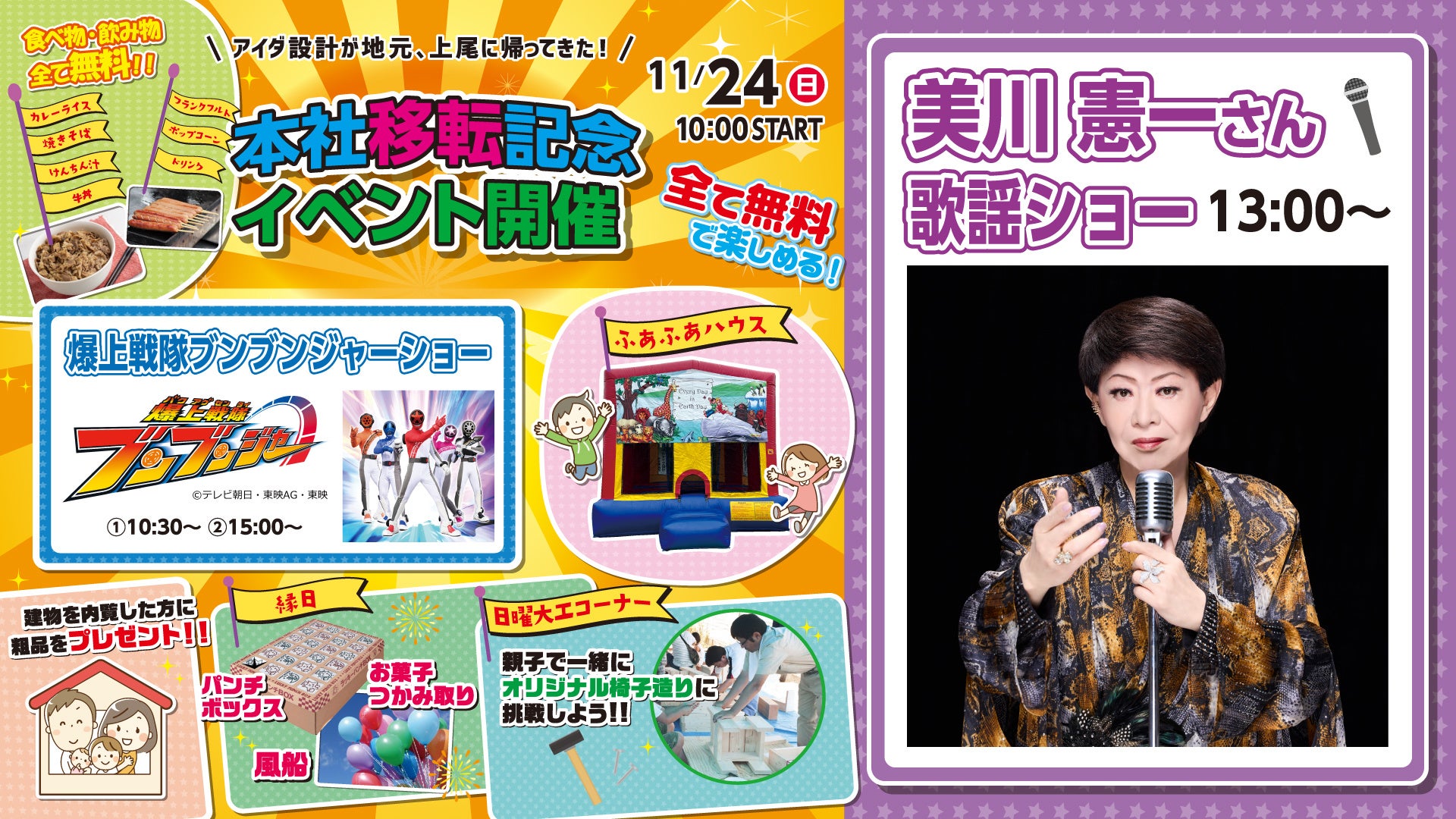 アイダ設計は、10月に本社を創業地である上尾市に移転しました。日ごろお世話になっている地域の皆様へ感謝の気持ちを伝え、地域の方と交流を深めるために、「アイダ設計 本社移転記念イベント」を開催いたします。イベント会場では、木材で椅子をつくる「大工体験」やお菓子つかみ取りなどの縁日、大型のエアー遊具、フードコーナー、「爆上戦隊ブンブンジャーショー」を実施いたします。さらに、「777万円の家」や「555万円の家」のCMキャラクターを務めていただいた美川憲一さんを特別ゲストにお呼びし、歌謡ショーを開催いたします。子どもから大人まで楽しめる参加無料のイベントとなっております。
