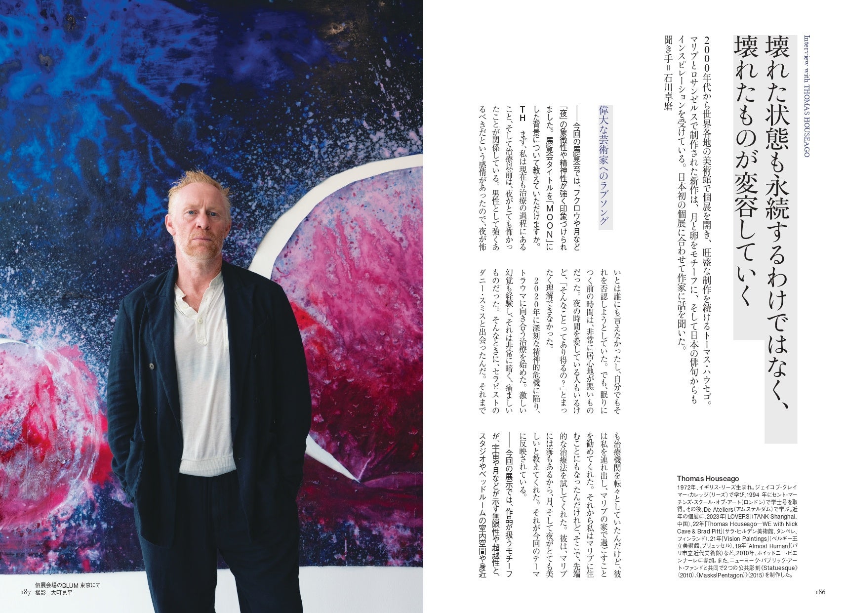 アーティスト・インタビューは、2000年代から世界各地の美術館で個展を開き、旺盛な制作を続けるトーマス・ハウセゴ。マリブとロサンゼルスで制作された新作は、月と卵をモチーフに、そして日本の俳句からもインスピレーションを受けている。日本初の個展に合わせて、美術家/美術批評の石川卓磨が話を聞いた。