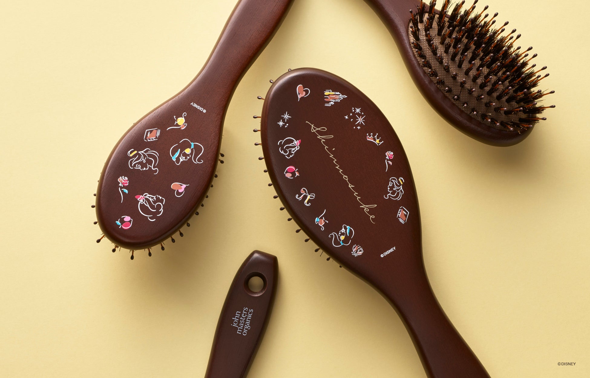 2サイズ展開のブラシ本体と化粧箱には、白雪姫、ジャスミン、ベルの3人のディズニープリンセスに加えて、リンゴやランプ、バラの花など、それぞれの作品中に登場する象徴的なアイテムのイラストをスタイリッシュに配置してデザイン。大人から子どもまで、広く愛されるディズニープリンセス同様、年代や世代を問わずご愛用いただけるアイテムです。