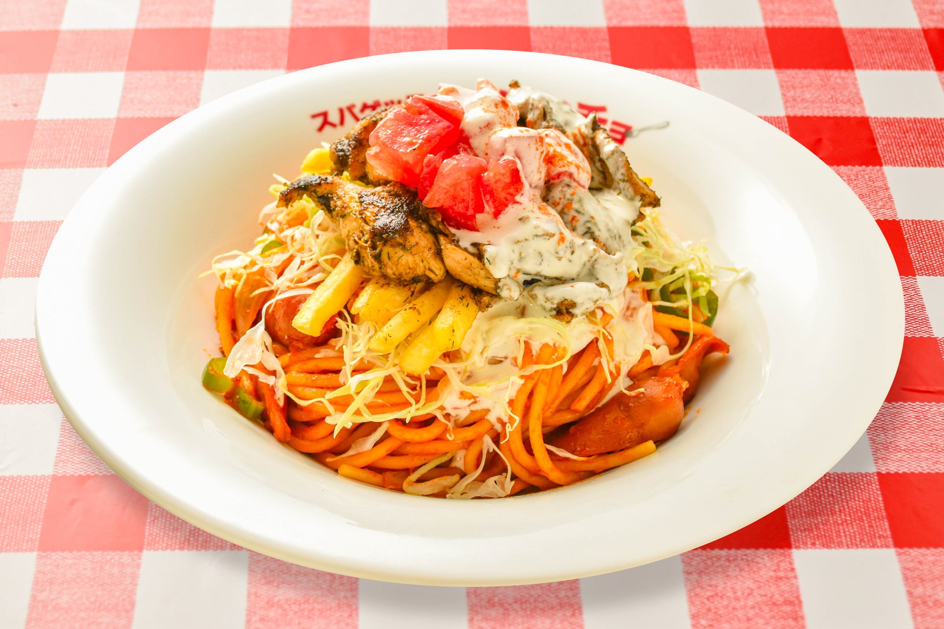 パンチョの期間限定トッピング「ケバブチキン」は一口食べれば異国情緒あふれる味わいが広がる、まるで専門店のケバブそのもの。ジューシーに焼き上げたチキンケバブを主役に、シャキシャキの千切りキャベツと食べ応え満点のホクホクのフライドポテトを敷き詰めました。彩り豊かな角切りトマトと特製のニンニク香るヨーグルトソースは味にアクセントと清涼感をプラスするだけでなく、ナポリタンとの融合を果たす大切な役目を担っています。
