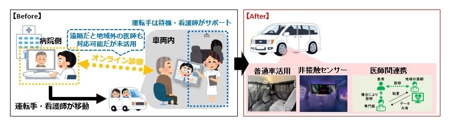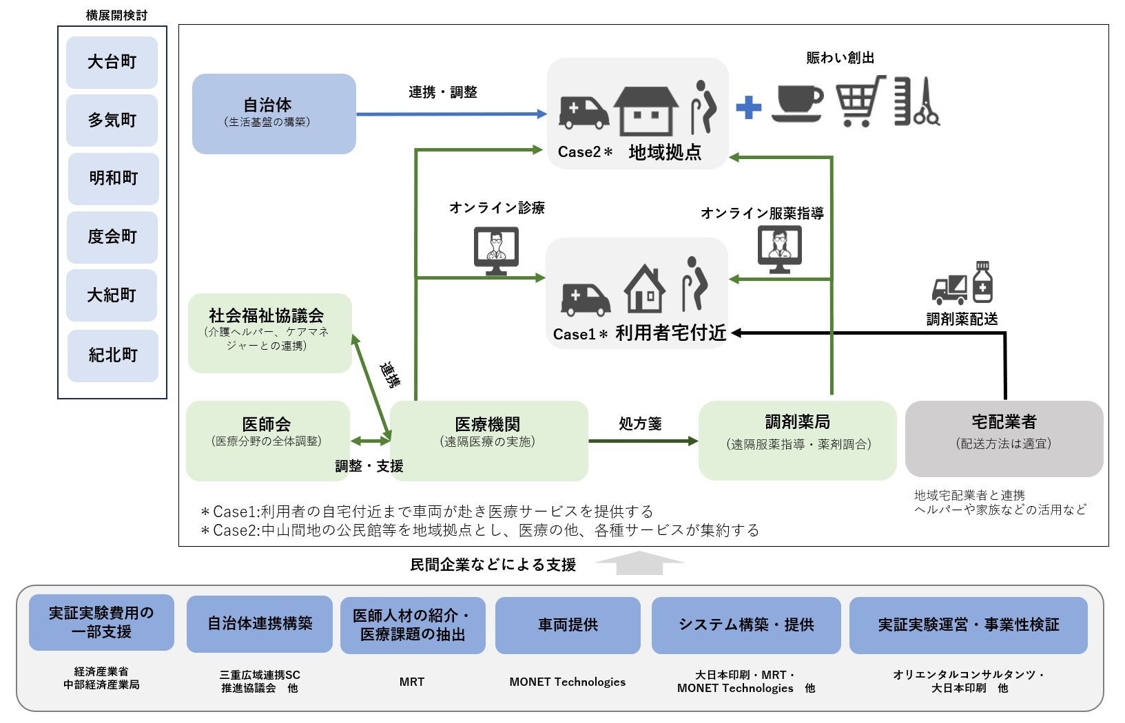 具体的には、「医療MaaSの省人化・効率化(医療MaaSのさらなる深化)」については、過年度の実証実験の評価等を踏まえ、三重県大台町や近隣地域(自治体)をフィールドに、小型乗用車の活用や機器の高度化、医師間連携の視点で検証します。また、「車両を活用した中山間地での地域拠点形成」については三重県度会町をフィールドに、中山間地近くの公共施設等を地域拠点とし、現状中心市街地まで走らせている公共交通機関の代替えとして、買い物、医療など生活に必要なサービスを集め、地域拠点までの移動をサポートすることで、地域の賑わいの創造と公共交通の再構築の可能性を検証します。
