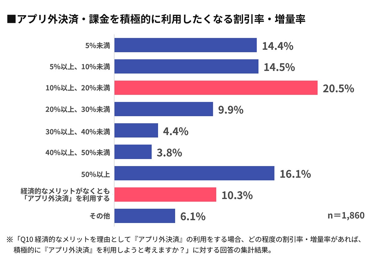 アプリ外決済・課金に対して消費者が求める金銭的メリットは「10%以上、20%未満」の割引率・増量率(20.5%)