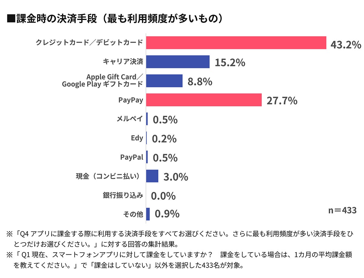 アプリ課金時の主な決済手段は「クレジットカード/デビットカード(43.2%)」と「PayPay(27.7%)」