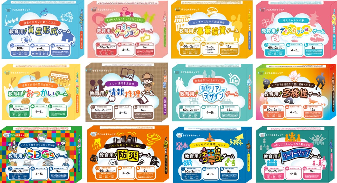 『子ども未来キャリア』は、子どものときから夢や目標を持ち、グローバル社会で必要となる知識と能力を育むキャリア教育用ボードゲーム教材です。ボードゲームを通じた疑似体験と、スライド教材を活用した学習を組み合わせた「遊び×学び」を融合した内容で、主体的に楽しく学ぶことができます。