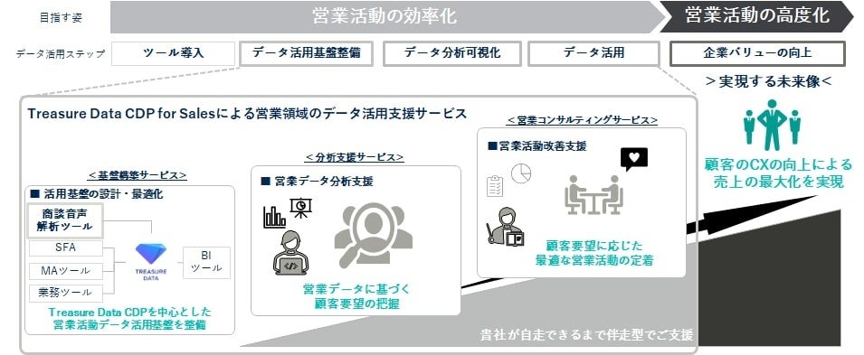 マーケティング領域での活用が主軸であるカスタマーデータプラットフォーム(以下、「CDP」)を、営業組織まで領域を広げることで、法人営業の企画担当者に対してデータ利活用の高度化を支援し、営業DXの実現に貢献していきます。