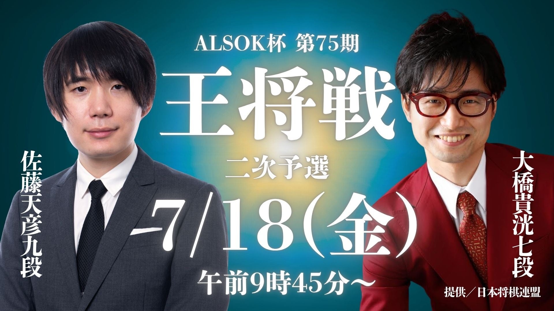 7月18日(金)「ALSOK杯 第75期王将戦 二次予選 佐藤天彦九段 vs 大橋貴洸七段」をYouTube&CS放送にて独占生中継!
