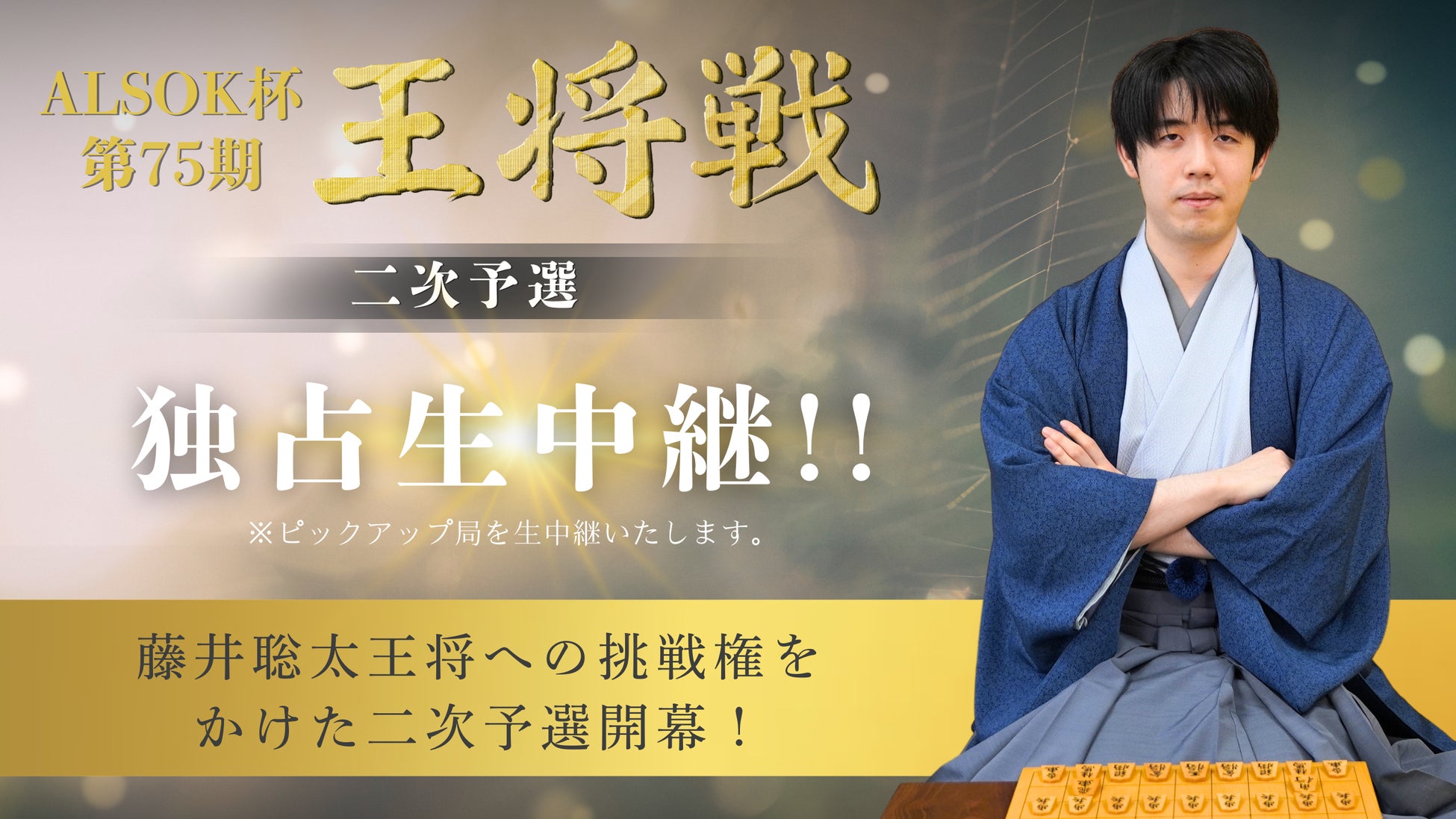 株式会社 囲碁将棋チャンネル(本社:東京都千代田区、代表取締役社長:山口哲史)が運営するYouTubeチャンネル「囲碁将棋プラス」およびCS放送「囲碁・将棋チャンネル」では、『ALSOK杯 第75期王将戦 二次予選』の注目対局を独占生中継いたします。