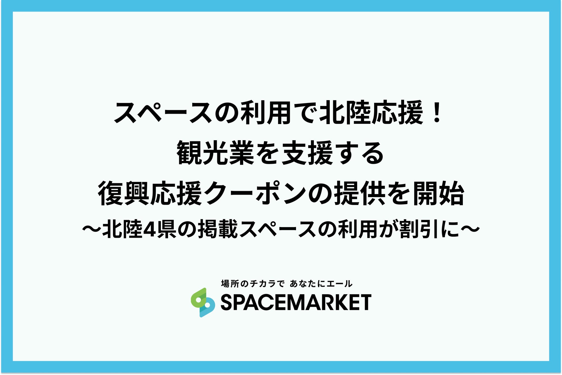 あらゆるスペースを貸し借りできるプラットフォーム「スペースマーケット」を運営する株式会社スペースマーケット(本社:東京都渋谷区、代表取締役社長:重松大輔、以下、スペースマーケット)は、令和6年能登半島地震(以下、能登地震)を受け、北陸4県の観光需要回復を目的にした復興応援クーポンを2024年4月1日(月)より提供開始いたします。