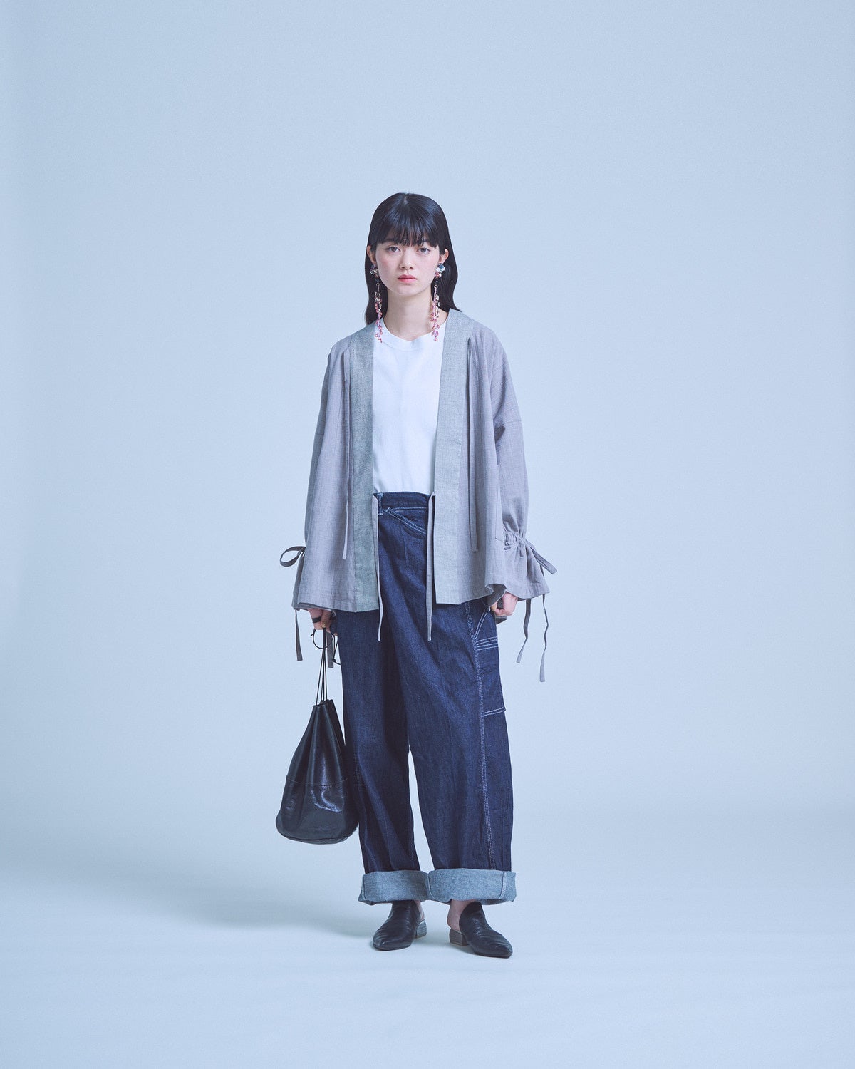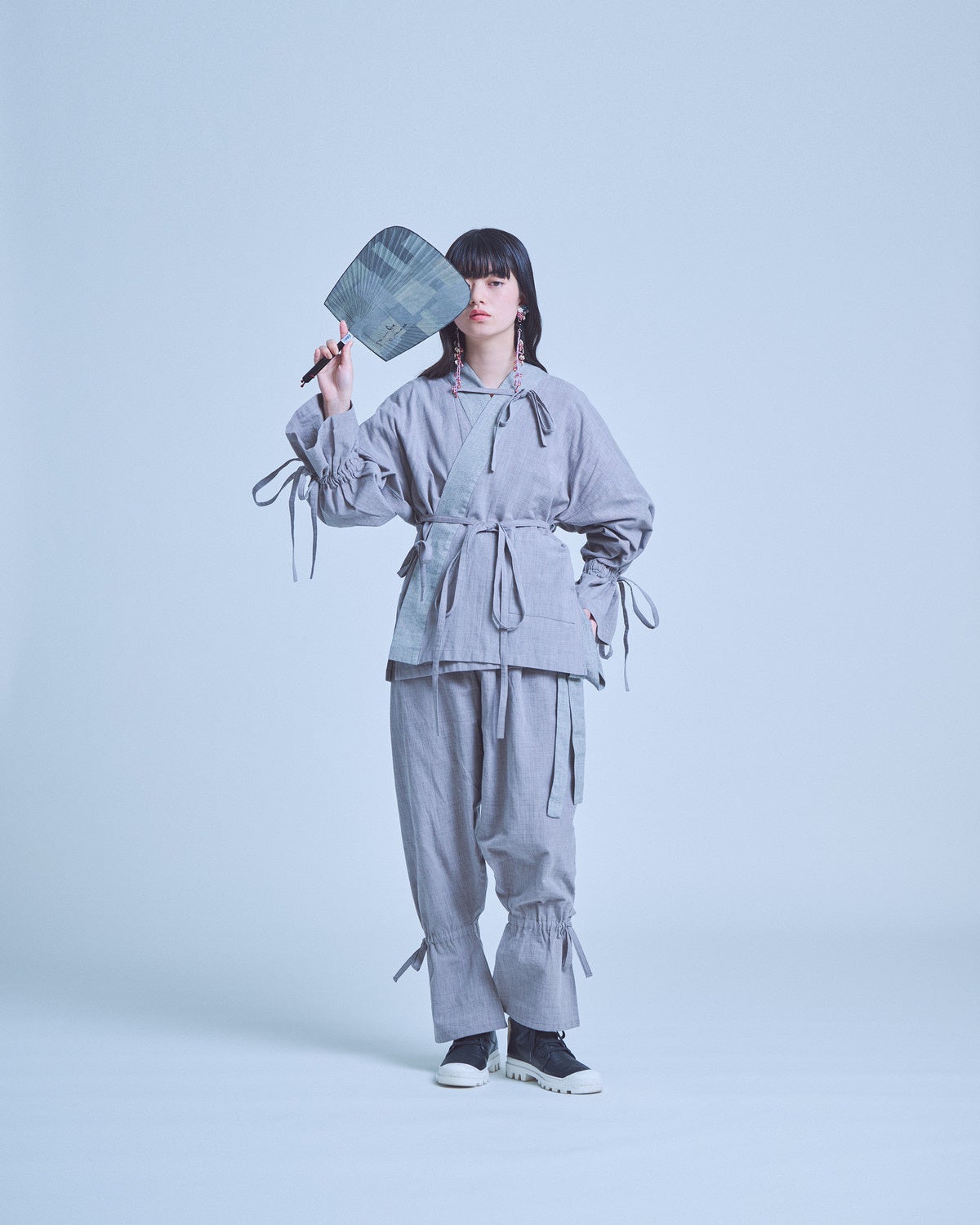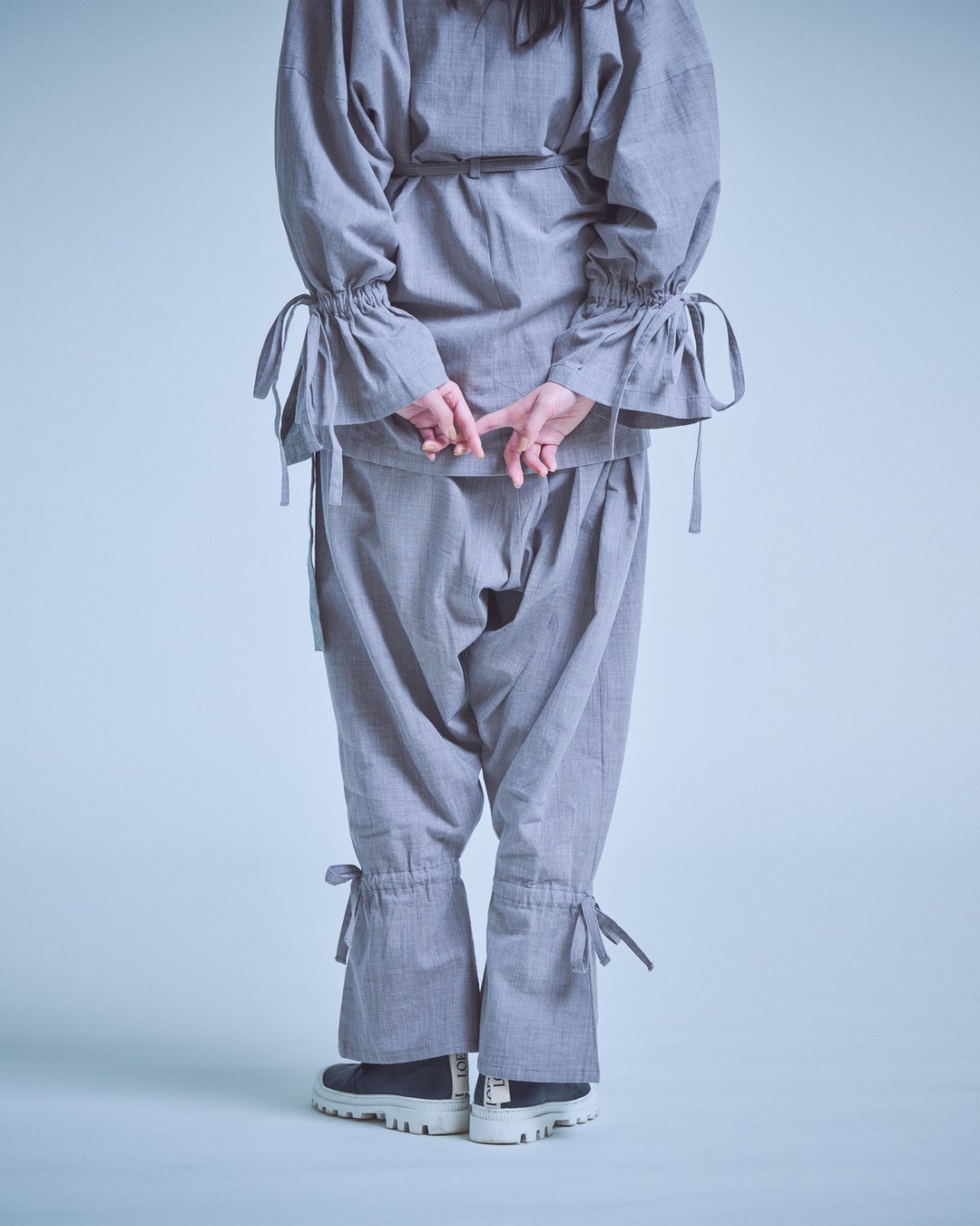 その作務衣の形はそのままに、KIMONO ARCHらしい遊び心を加えました。シンプルなデザインのなかに、衿元や袖口にリボンやギャザーをあしらい、思わず飛び跳ねたくなるような軽やかさを添えています。