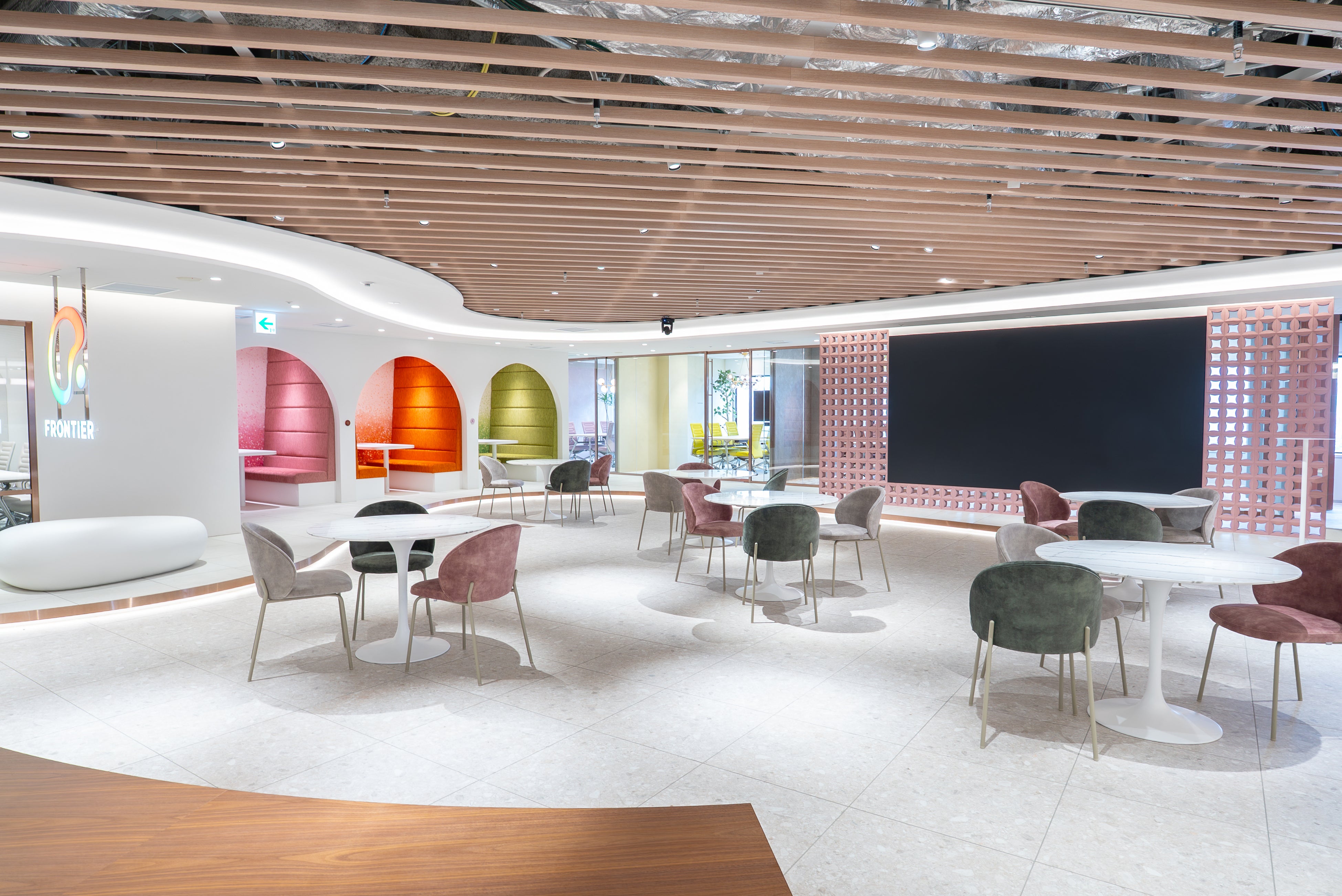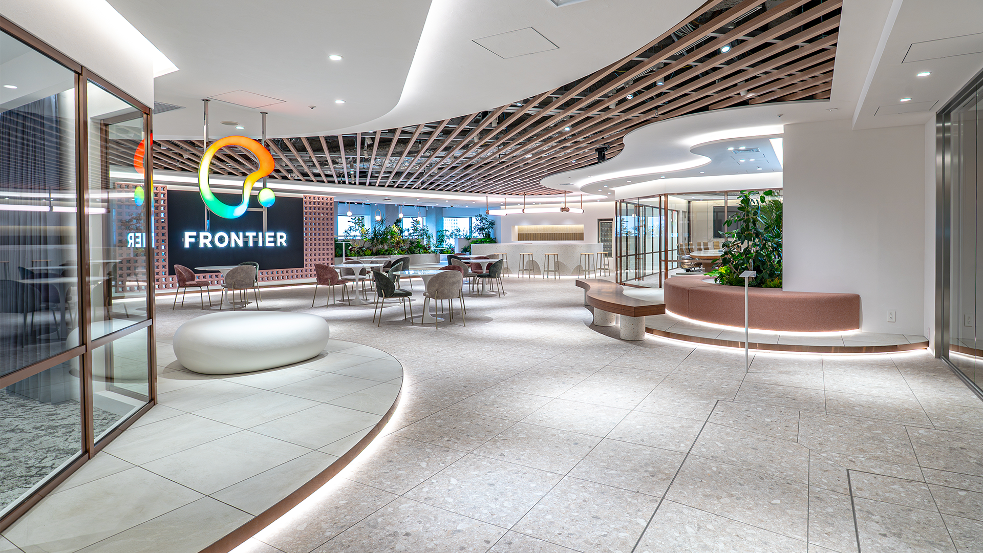 2. オフィスデザインの核となるのは、人との繋がり(コミュニティ)を彷彿とさせる「輪」をベースにした曲線的な設計です。これは「企業や一人ひとりの想いをカタチにし、繋げたい」という理念を象徴するコーポレートロゴを模した作りとなっており、空間そのものが企業のアイデンティティを体現しています