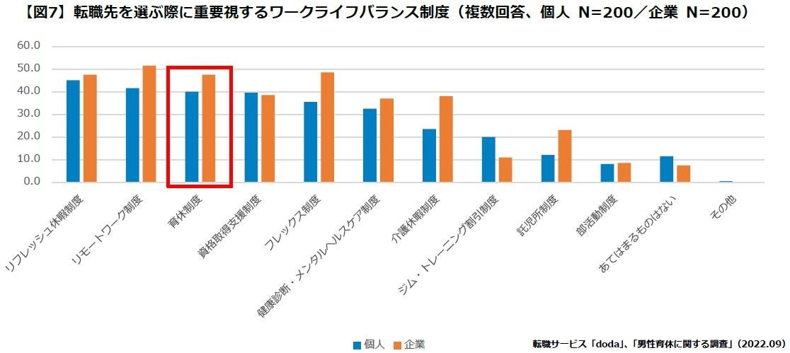 また、様々なワークライフバランス制度がある中で、転職先を選ぶ際に「育休制度」がどの程度重要視されているかを調査したところ、個人では「リフレッシュ休暇制度(45.0%)」、「リモートワーク制度(41.5%)」についで40.0%、企業では「リモートワーク制度(51.5%)」、「フレックス制度(48.5%)」についで47.5%と、ともに上位に来る結果となりました。(【図7】参照)