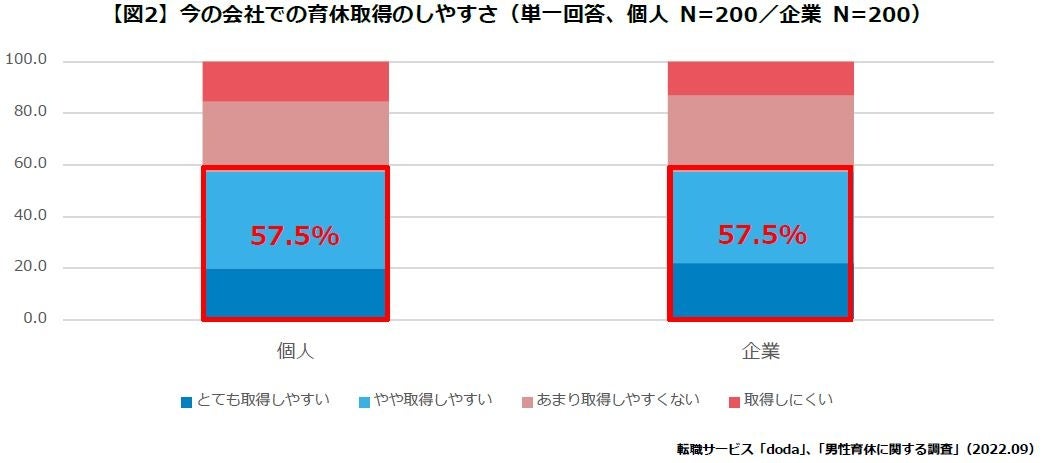 個人・企業ともに今の会社で育休を取得しやすいと回答した人は57.5%とギャップなし