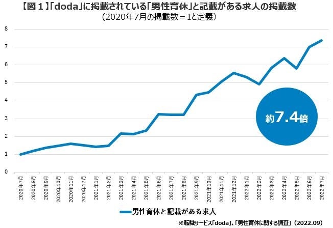 転職サービス「doda」が扱う約15万件※3の求人から、「男性育休」と記載がある求人※4を確認したところ、2021年2月以降から伸長が続き、2022年7月時点では約7.4倍(2020年7月対比)となっています。(【図1】参照)これは、2021年6月に可決された「改正育児・介護休業法」をきっかけとして、男性の育休取得に向けた制度環境の整備が進み、企業における意識が少しずつ高まっている影響が一因と考えられます。