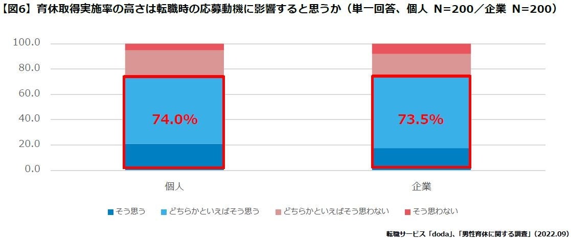 個人・企業(転職希望者について回答)に対して「育休取得実施率の高さは転職時の応募に影響するか?」と尋ねたところ、個人は74.0%、企業は73.5%が「影響する」と回答。育休制度が転職時の応募動機の1つになっていることが伺えます。(【図6】参照)